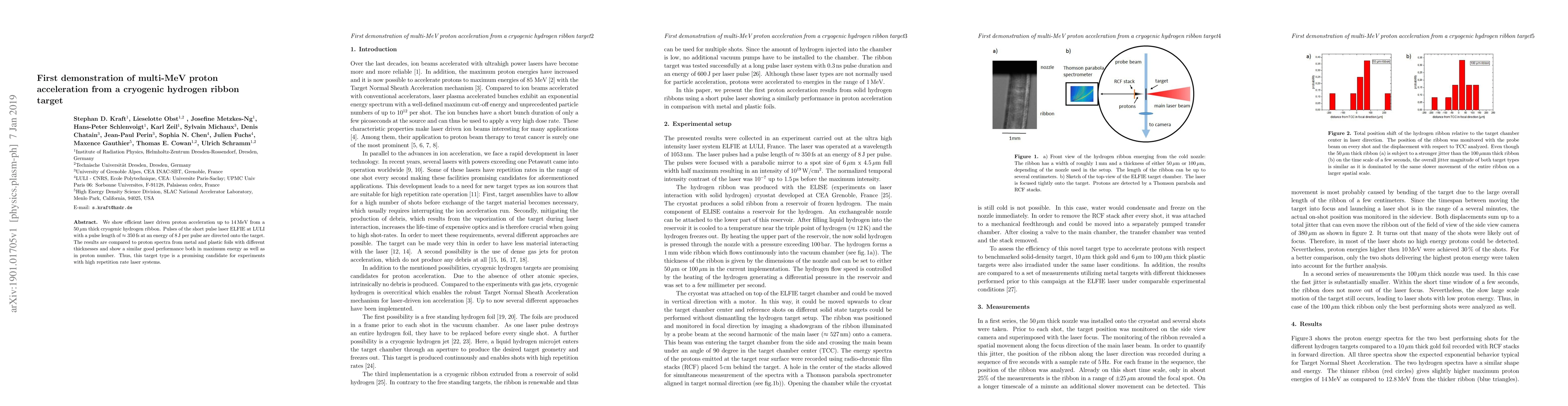 We show efficient laser driven proton acceleration up to 14MeV from a 50 $\mu$m thick cryogenic hydrogen ribbon. Pulses of the short pulse laser ELFIE at LULI with a pulse length of $\approx$ 350 fs at an energy of 8 J per pulse are directed onto the target. The results are compared to proton spectra from metal and plastic foils with different thicknesses and show a similar good performance both in maximum energy as well as in proton number. Thus, this target type is a promising candidate for experiments with high repetition rate laser systems.