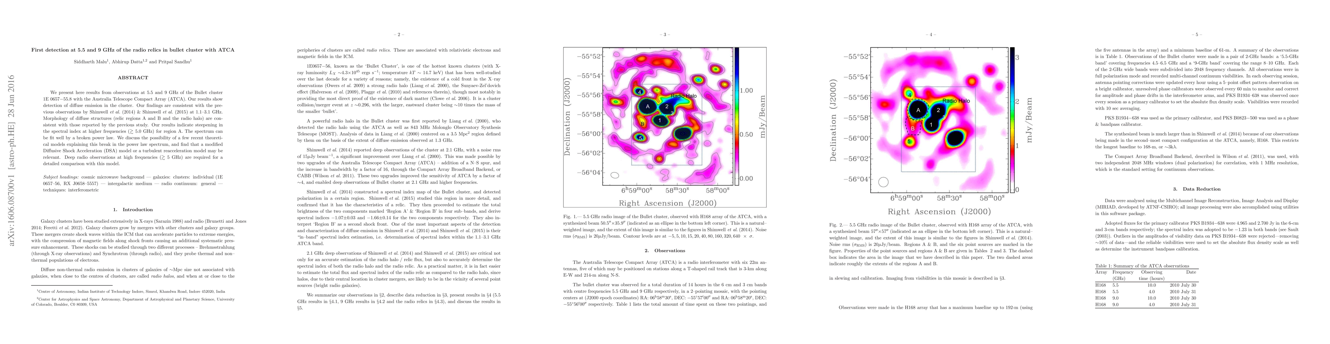 Researchers detected radio relics in the Bullet cluster at 5.5 and 9 GHz frequencies, consistent with previous findings, and observed a steepening in spectral index at higher frequencies, which may be explained by modified Diffusive Shock Acceleration or turbulent reacceleration models.