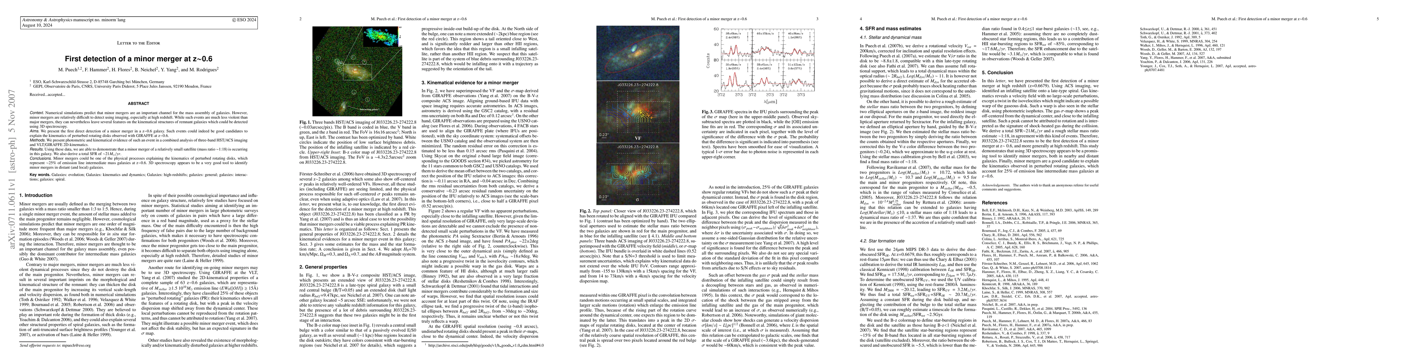 Numerical simulations predict that minor mergers are an important channel for the mass assembly of galaxies. However, minor mergers are relatively difficult to detect using imaging, especially at high redshift. While such events are much less violent than major mergers, they can nevertheless leave several features on the kinematical structures of remnant galaxies which could be detected using 3D spectroscopy. We present the first direct detection of a minor merger in a z~0.6 galaxy. Such events could indeed be good candidates to explain the kinematics of perturbed rotating disks observed with GIRAFFE at z~0.6. We present photometric and kinematical evidence of such an event in a combined analysis of three-band HST/ACS imaging and VLT/GIRAFFE 2D-kinematics. Using these data, we are able to demonstrate that a minor merger of a relatively small satellite (mass ratio ~1:18) is occurring in this galaxy. We also derive a total SFR ~21Mo/yr. Minor mergers could be one of the physical processes explaining the kinematics of perturbed rotating disks, which represent ~25% of emission line intermediate mass galaxies at z~0.6. 3D spectroscopy appears to be a very good tool to identify minor mergers in distant (and local) galaxies.