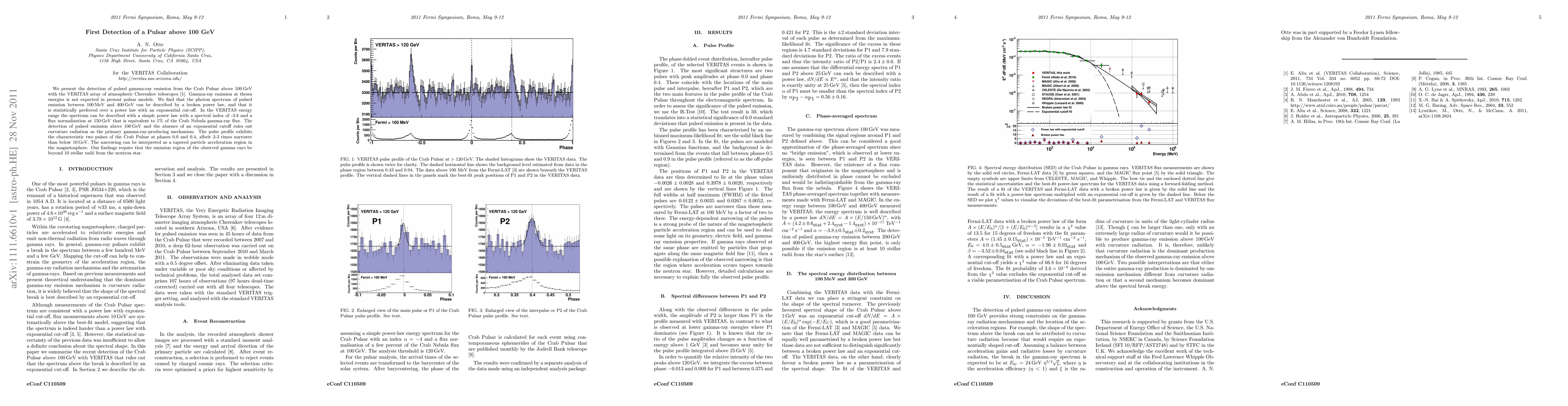The VERITAS array detected pulsed gamma-ray emission from the Crab Pulsar above 100 GeV, challenging current pulsar models. The observed spectrum follows a broken power law, indicating a tapered particle acceleration region beyond 10 stellar radii.