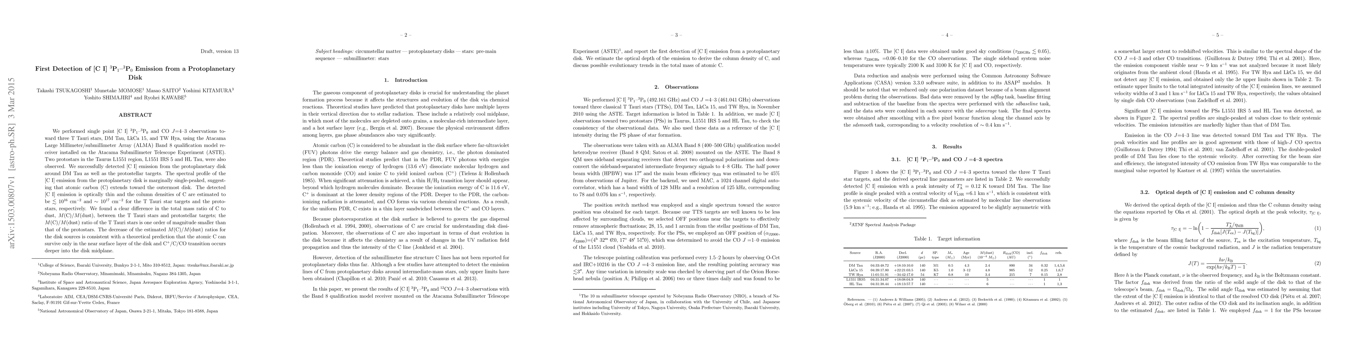We performed single point [C I] $^3$P$_1$-$^3$P$_0$ and CO J=4-3 observations toward three T Tauri stars, DM Tau, LkCa 15, and TW Hya, using the Atacama Large Millimeter/submillimeter Array (ALMA) Band 8 qualification model receiver installed on the Atacama Submillimeter Telescope Experiment (ASTE). Two protostars in the Taurus L1551 region, L1551 IRS 5 and HL Tau, were also observed. We successfully detected [C I] emission from the protoplanetary disk around DM Tau as well as the protostellar targets. The spectral profile of the [C I] emission from the protoplanetary disk is marginally single-peaked, suggesting that atomic carbon (C) extends toward the outermost disk. The detected [C I] emission is optically thin and the column densities of C are estimated to be <~10$^{16}$ cm$^{-2}$ and ~10$^{17}$ cm$^{-2}$ for the T Tauri star targets and the protostars, respectively. We found a clear difference in the total mass ratio of C to dust, $M$(C)/$M$(dust), between the T Tauri stars and protostellar targets; the $M$(C)/$M$(dust) ratio of the T Tauri stars is one order of magnitude smaller than that of the protostars. The decrease of the estimated $M$(C)/$M$(dust) ratios for the disk sources is consistent with a theoretical prediction that the atomic C can survive only in the near surface layer of the disk and C$^+$/C/CO transition occurs deeper into the disk midplane.