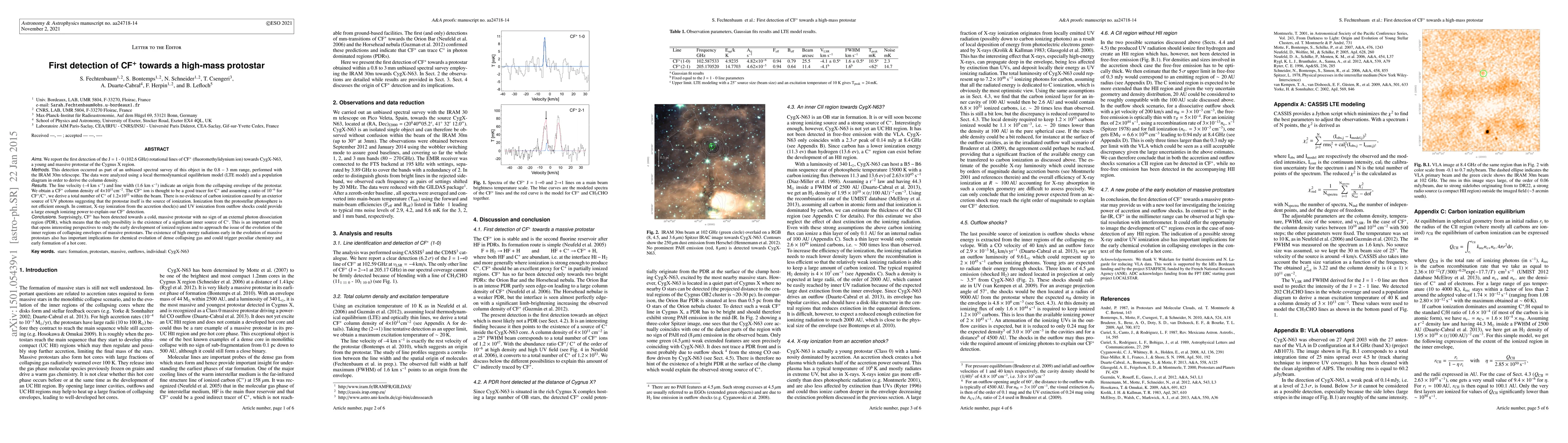 We report the first detection of the J = 1 - 0 (102.6 GHz) rotational lines of CF+ (fluoromethylidynium ion) towards CygX-N63, a young and massive protostar of the Cygnus X region. This detection occurred as part of an unbiased spectral survey of this object in the 0.8-3 mm range, performed with the IRAM 30m telescope. The data were analyzed using a local thermodynamical equilibrium model (LTE model) and a population diagram in order to derive the column density. The line velocity (-4 km s-1) and line width (1.6 km s-1) indicate an origin from the collapsing envelope of the protostar. We obtain a CF+ column density of 4.10e11 cm-2. The CF+ ion is thought to be a good tracer for C+ and assuming a ratio of 10e-6 for CF+/C+, we derive a total number of C+ of 1.2x10e53 within the beam. There is no evidence of carbon ionization caused by an exterior source of UV photons suggesting that the protostar itself is the source of ionization. Ionization from the protostellar photosphere is not efficient enough. In contrast, X-ray ionization from the accretion shock(s) and UV ionization from outflow shocks could provide a large enough ionizing power to explain our CF+ detection. Surprisingly, CF+ has been detected towards a cold, massive protostar with no sign of an external photon dissociation region (PDR), which means that the only possibility is the existence of a significant inner source of C+. This is an important result that opens interesting perspectives to study the early development of ionized regions and to approach the issue of the evolution of the inner regions of collapsing envelopes of massive protostars. The existence of high energy radiations early in the evolution of massive protostars also has important implications for chemical evolution of dense collapsing gas and could trigger peculiar chemistry and early formation of a hot core.