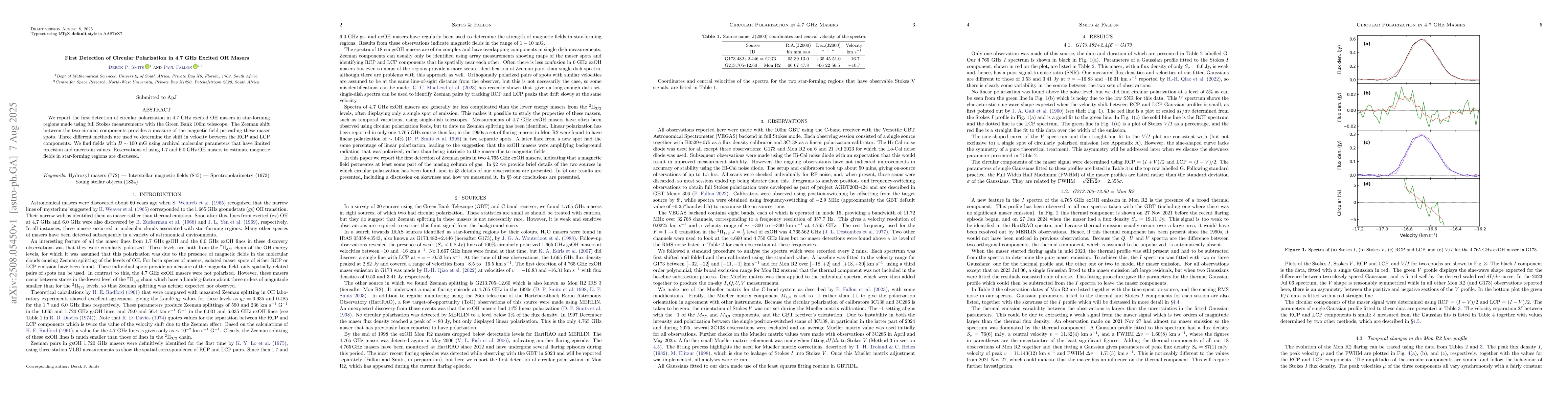 We report the first detection of circular polarization in 4.7 GHz excited OH masers in star-forming regions made using full Stokes measurements with the Green Bank 100m telescope. The Zeeman shift between the two circular components provides a measure of the magnetic field pervading these maser spots. Three different methods are used to determine the shift in velocity between the Right Circular Polarization and Left Circular Polarization components. We find fields with $B \sim 100$ mG using archival molecular parameters that have limited precision and uncertain values. Reservations of using 1.7 and 6.0 GHz OH masers to estimate magnetic fields in star-forming regions are discussed.
