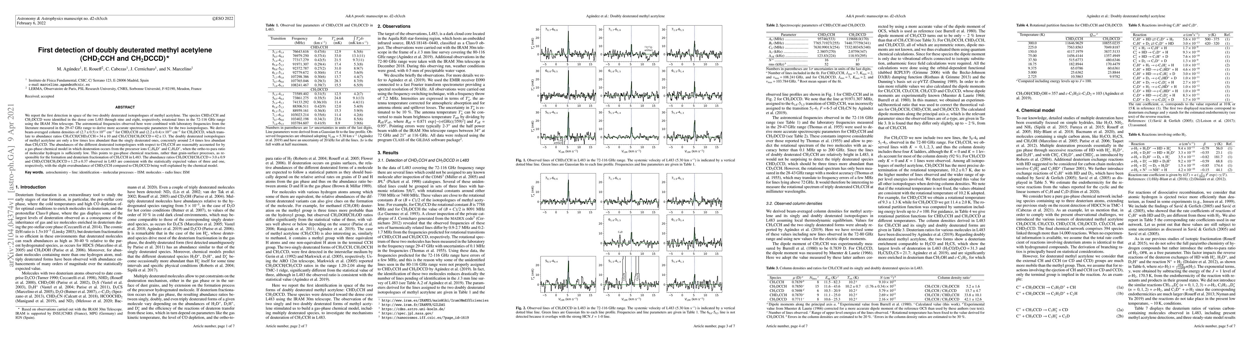 The research utilized the IRAM 30m telescope to detect doubly deuterated methyl acetylene isotopologues (CHD2CCH and CH2DCCD) in the dense core L483 through rotational lines in the 72-116 GHz range. Laboratory frequencies from 29-47 GHz were combined with astronomical observations to derive more accurate spectroscopic parameters.