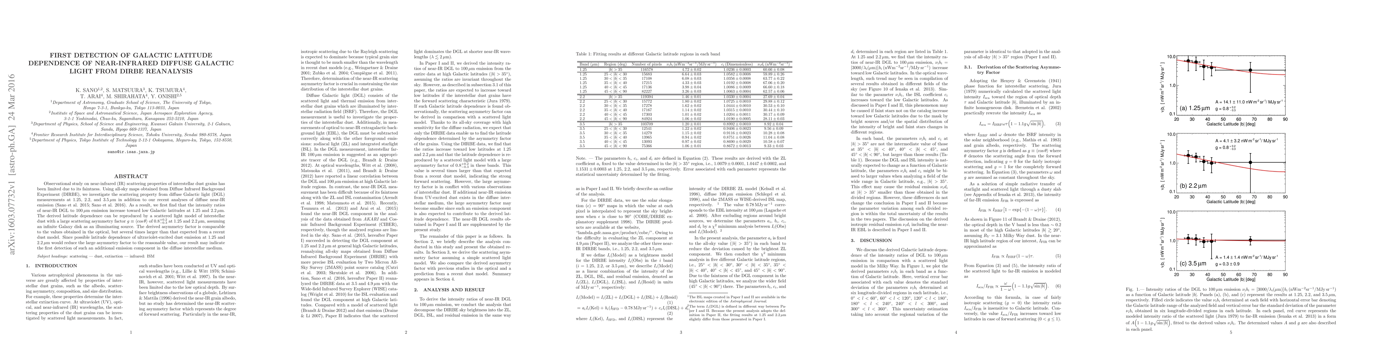 This study reanalyzes DIRBE data to detect a galactic latitude dependence in near-infrared diffuse Galactic light, revealing that intensity ratios increase toward lower latitudes at 1.25 and 2.2 μm. The findings suggest a large scattering asymmetry factor, indicating potential ultraviolet-excited dust emission components in the interstellar medium.