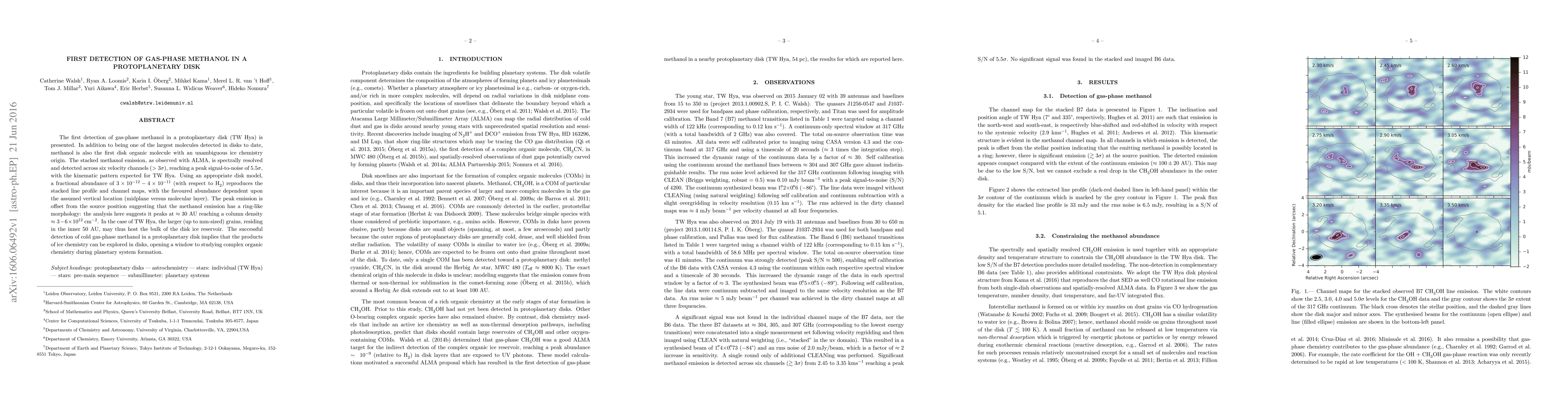 The first detection of gas-phase methanol in the protoplanetary disk around TW Hya has been achieved using ALMA, revealing a ring-like morphology and suggesting a fractional abundance of $3\times 10^{-12} - 4 \times 10^{-11}$ relative to H$_2$. This discovery opens new avenues for studying complex organic chemistry in planetary formation.