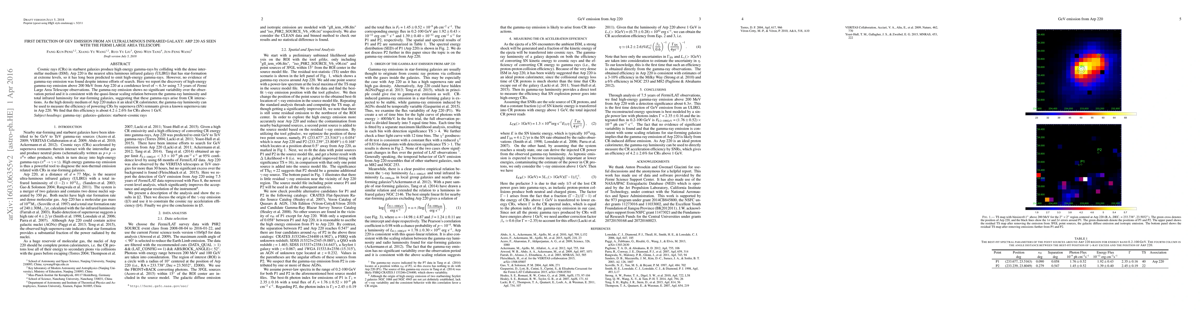 The Fermi Large Area Telescope detected high-energy gamma-ray emission above 200 MeV from Arp 220, the nearest ultraluminous infrared galaxy with extreme star-formation levels, at a confidence level of $\sim 6.3 \sigma$. The gamma-ray emission is consistent with cosmic ray interactions in the dense interstellar medium, suggesting an efficiency of about $4.2\pm2.6\%$ for powering cosmic rays above 1 GeV.