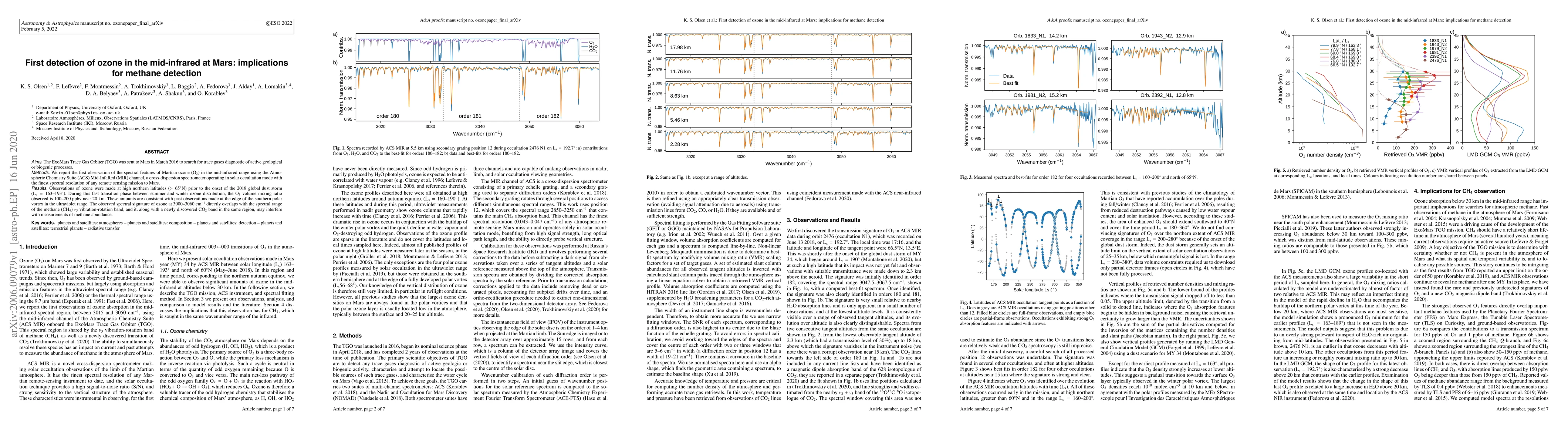 The ExoMars Trace Gas Orbiter detected Martian ozone in the mid-infrared for the first time, revealing a volume mixing ratio of 100-200 ppbv at high northern latitudes. The spectral overlap of ozone and methane signatures may complicate methane detection efforts.