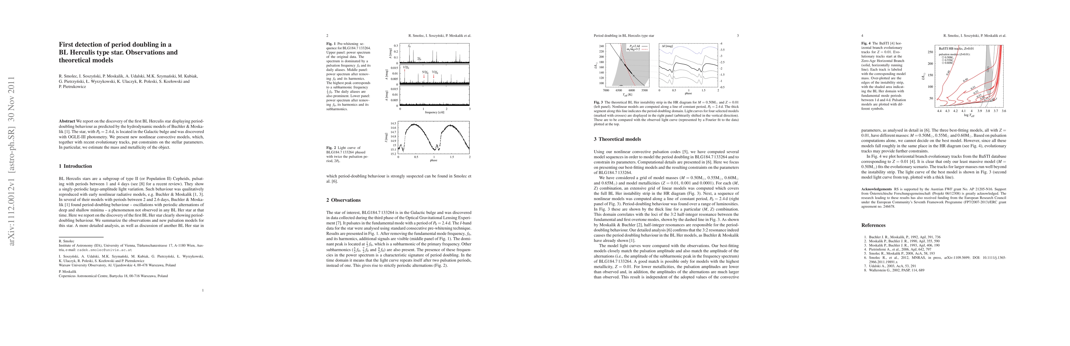 This paper reports the first detection of period doubling in a BL Herculis star, observed in the Galactic bulge using OGLE-III photometry, confirming predictions by Buchler & Moskalik. New nonlinear convective models and evolutionary tracks provide constraints on the star's mass and metallicity.