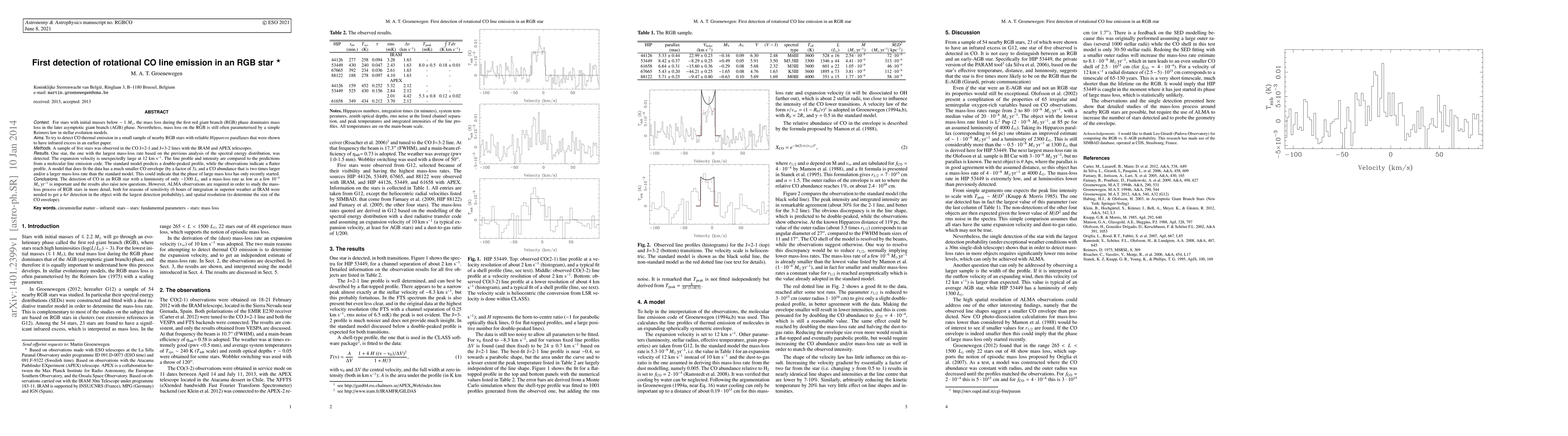 Context: For stars with initial masses below about 1 solar mass, the mass loss during the first red giant branch (RGB) phase dominates mass loss in the later asymptotic giant branch (AGB) phase. Nevertheless, mass loss on the RGB is still often parameterised by a simple Reimers law in stellar evolution models. Aims: To try to detect CO thermal emission in a small sample of nearby RGB stars with reliable Hipparcos parallaxes that were shown to have infrared excess in an earlier paper. Methods: A sample of five stars was observed in the CO J=2-1 and J=3-2 lines with the IRAM and APEX telescopes. Results: One star, the one with the largest mass-loss rate based on the previous analysis of the spectral energy distribution, was detected. The expansion velocity is unexpectedly large at 12 km/s. The line profile and intensity are compared to the predictions from a molecular line emission code. The standard model predicts a double-peaked profile, while the observations indicate a flatter profile. A model that does fit the data has a much smaller CO envelope (by a factor of 3), and a CO abundance that is two times larger and/or a larger mass-loss rate than the standard model. This could indicate that the phase of large mass loss has only recently started. Conclusions: The detection of CO in an RGB star with a luminosity of only about 1300 solar luminosities and a mass-loss rate as low as a few 10(-9) solarmasses/yr is important and the results also raise new questions. However, ALMA observations are required in order to study the mass-loss process of RGB stars in more detail, both for reasons of sensitivity (6 hours of integration in superior weather at IRAM were needed to get a 4sigma detection in the object with the largest detection probability), and spatial resolution (to determine the size of the CO envelope).