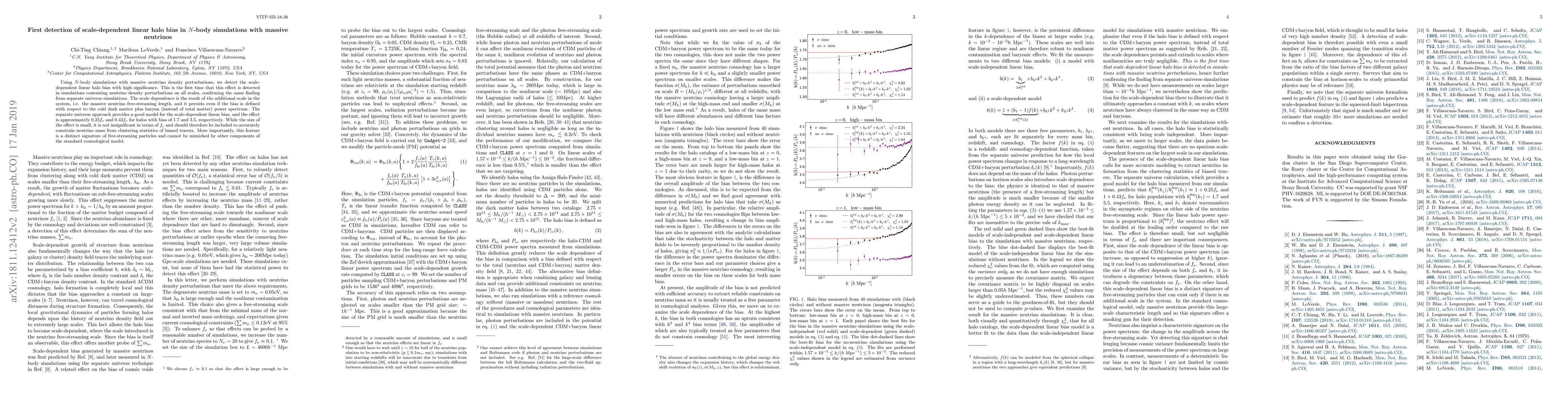 Using $N$-body simulations with massive neutrino density perturbations, we detect the scale-dependent linear halo bias with high significance. This is the first time that this effect is detected in simulations containing neutrino density perturbations on all scales, confirming the same finding from separate universe simulations. The scale dependence is the result of the additional scale in the system, i.e. the massive neutrino free-streaming length, and it persists even if the bias is defined with respect to the cold dark matter plus baryon (instead of total matter) power spectrum. The separate universe approach provides a good model for the scale-dependent linear bias, and the effect is approximately $0.25f_\nu$ and $0.43f_\nu$ for halos with bias of 1.7 and 3.5, respectively. While the size of the effect is small, it is ${\it not}$ insignificant in terms of $f_\nu$ and should therefore be included to accurately constrain neutrino mass from clustering statistics of biased tracers. More importantly, this feature is a distinct signature of free-streaming particles and cannot be mimicked by other components of the standard cosmological model.