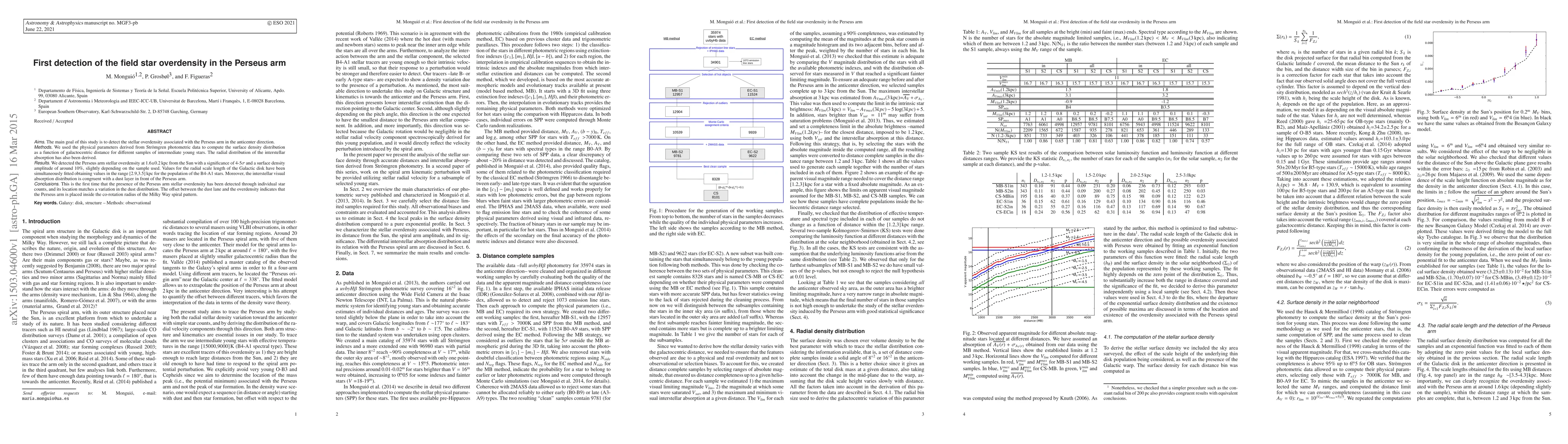 Aims. The main goal of this study is to detect the stellar overdensity associated with the Perseus arm in the anticenter direction. Methods. We used the physical parameters derived from Str\"omgren photometric data to compute the surface density distribution as a function of galactocentric distance for different samples of intermediate young stars. The radial distribution of the interstellar absorption has also been derived. Results. We detected the Perseus arm stellar overdensity at 1.6+-0.2 kpc from the Sun with a significance of 4-5{\sigma} and a surface density amplitude of around 10%, slightly depending on the sample used. Values for the radial scale length of the Galactic disk have been simultaneously fitted obtaining values in the range [2.9,3.5] kpc for the population of the B4-A1 stars. Moreover, the interstellar visual absorption distribution is congruent with a dust layer in front of the Perseus arm. Conclusions. This is the first time that the presence of the Perseus arm stellar overdensity has been detected through individual star counts, and its location matches a variation in the dust distribution. The offset between the dust lane and the overdensity indicates that the Perseus arm is placed inside the co-rotation radius of the Milky Way spiral pattern.