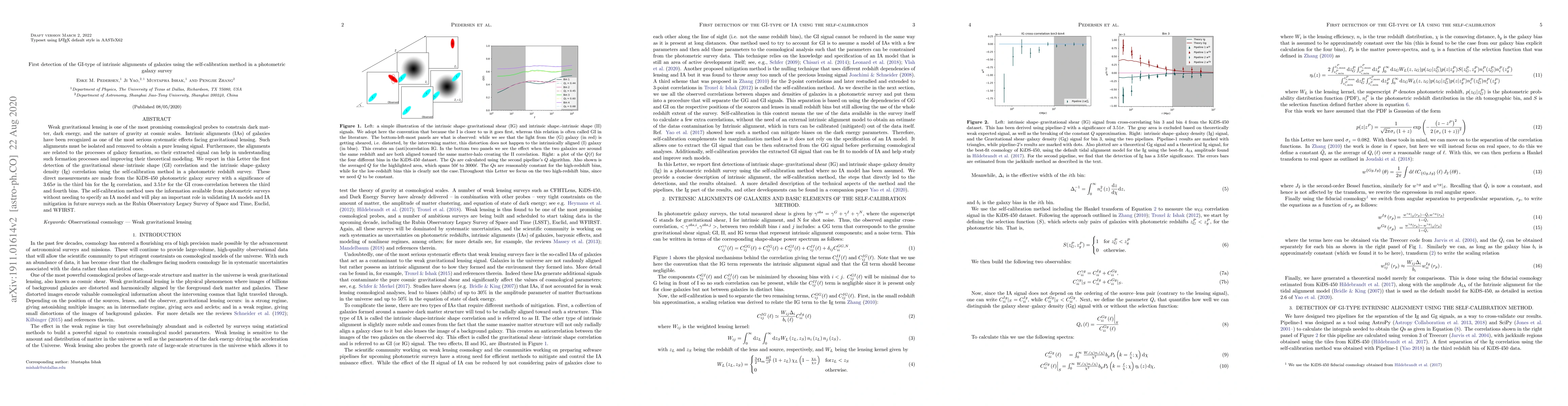 Weak gravitational lensing is one of the most promising cosmological probes to constrain dark matter, dark energy, and the nature of gravity at cosmic scales. Intrinsic alignments (IAs) of galaxies have been recognized as one of the most serious systematic effects facing gravitational lensing. Such alignments must be isolated and removed to obtain a pure lensing signal. Furthermore, the alignments are related to the processes of galaxy formation, so their extracted signal can help in understanding such formation processes and improving their theoretical modeling. We report in this Letter the first detection of the gravitational shear--intrinsic shape (GI) correlation and the intrinsic shape--galaxy density (Ig) correlation using the self-calibration method in a photometric redshift survey. These direct measurements are made from the KiDS-450 photometric galaxy survey with a significance of 3.65$\sigma$ in the third bin for the Ig correlation, and 3.51$\sigma$ for the GI cross-correlation between the third and fourth bins. The self-calibration method uses the information available from photometric surveys without needing to specify an IA model and will play an important role in validating IA models and IA mitigation in future surveys such as the Rubin Observatory Legacy Survey of Space and Time, Euclid, and WFIRST.