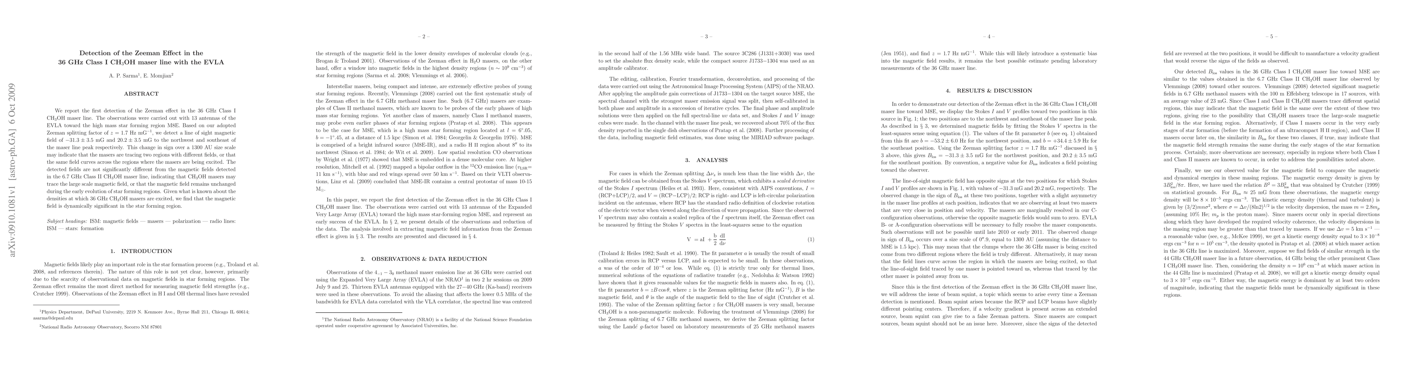 This paper reports the first detection of the Zeeman effect in the 36 GHz Class I methanol maser line using the EVLA, revealing a magnetic field of -31.3 +/- 3.5 mG and 20.2 +/- 3.5 mG in different regions. The findings suggest that methanol masers may trace the large-scale magnetic field in star-forming regions.