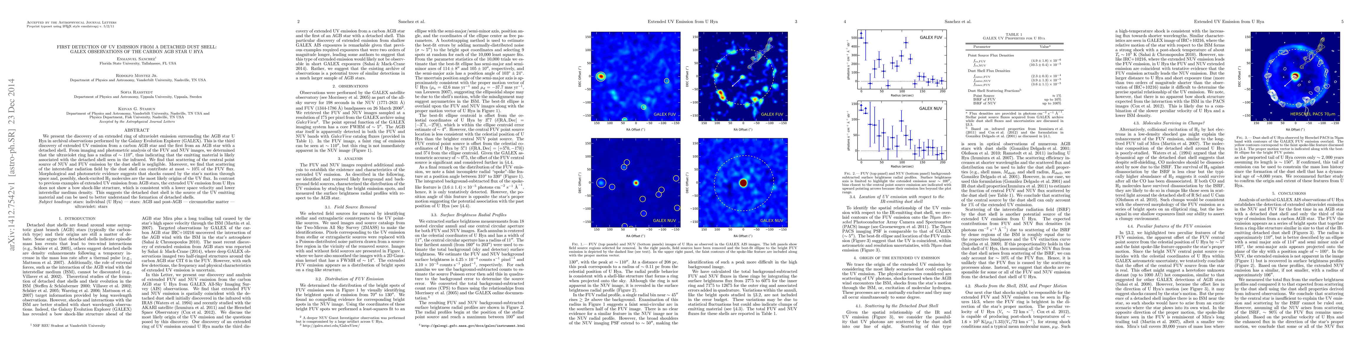 Researchers detect UV emission from a detached dust shell surrounding carbon AGB star U Hya for the first time using GALEX observations, finding it may originate from shock-excited molecules or star motion through space.