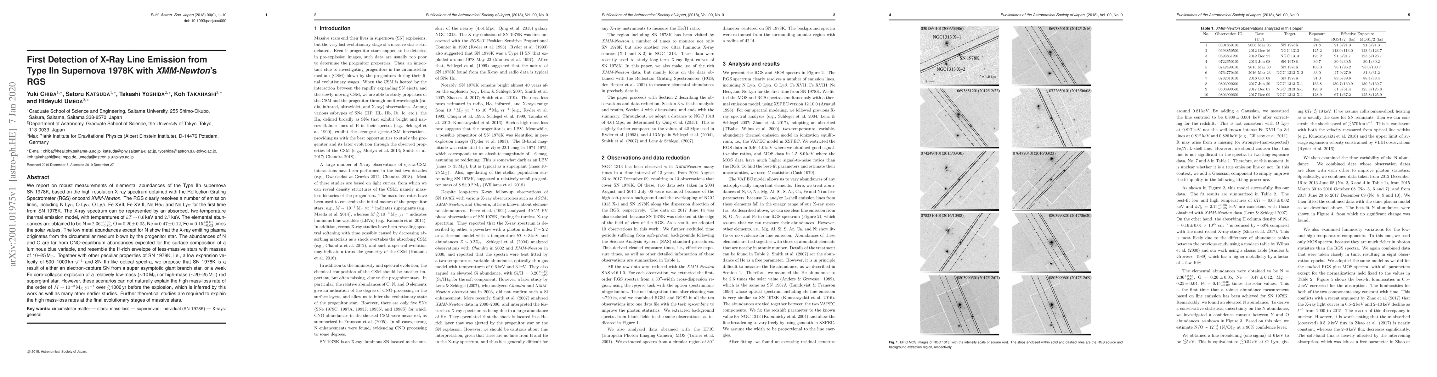 This study, using XMM-Newton's RGS, first detects X-ray line emission from Type IIn supernova SN 1978K. It finds a two-temperature plasma with temperatures ~0.6 keV and ~2.7 keV, and derives low metal abundances (N, O, Ne, Fe) relative to solar values, suggesting the plasma originates from the progenitor's circumstellar medium. The abundances indicate the progenitor might have been a low-mass (10 M$_odot$) or high-mass (20-25 M$_odot$) red supergiant. The research highlights a high mass-loss rate, unexplained by current theories, necessitating further study.