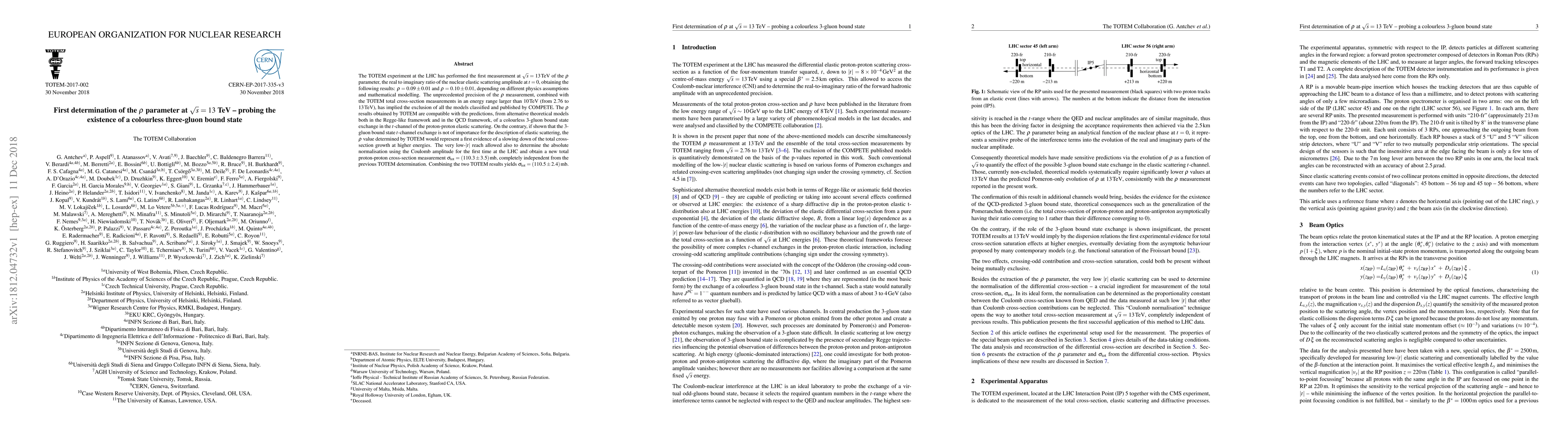 The TOTEM experiment at the LHC first measured the $\rho$ parameter at $\sqrt{s} = 13$ TeV, finding $\rho = 0.09 \pm 0.01$ and $\rho = 0.10 \pm 0.01$, which supports the existence of a colourless three-gluon bound state and excludes existing COMPETE models. The results also provide new total proton-proton cross-section measurements.