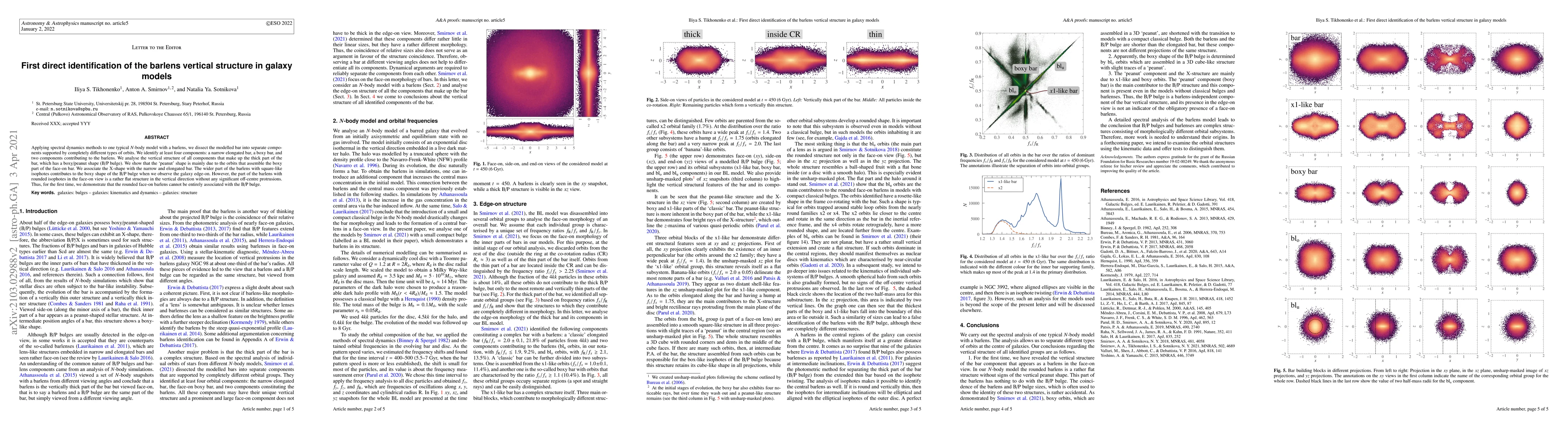 Applying spectral dynamics methods to one typical $N$-body model with a barlens, we dissect the modelled bar into separate components supported by completely different types of orbits. We identify at least four components: a narrow elongated bar, a boxy bar, and two components contributing to the barlens. We analyse the vertical structure of all components that make up the thick part of the bar, which has a boxy/peanut shape (B/P bulge). We show that the `peanut' shape is mainly due to the orbits that assemble the boxy part of the face-on bar. We associate the X-shape with the narrow and elongated bar. The wider part of the barlens with square-like isophotes contributes to the boxy shape of the B/P bulge when we observe the galaxy edge-on. However, the part of the barlens with rounded isophotes in the face-on view is a rather flat structure in the vertical direction without any significant off-centre protrusions. Thus, for the first time, we demonstrate that the rounded face-on barlens cannot be entirely associated with the B/P bulge.