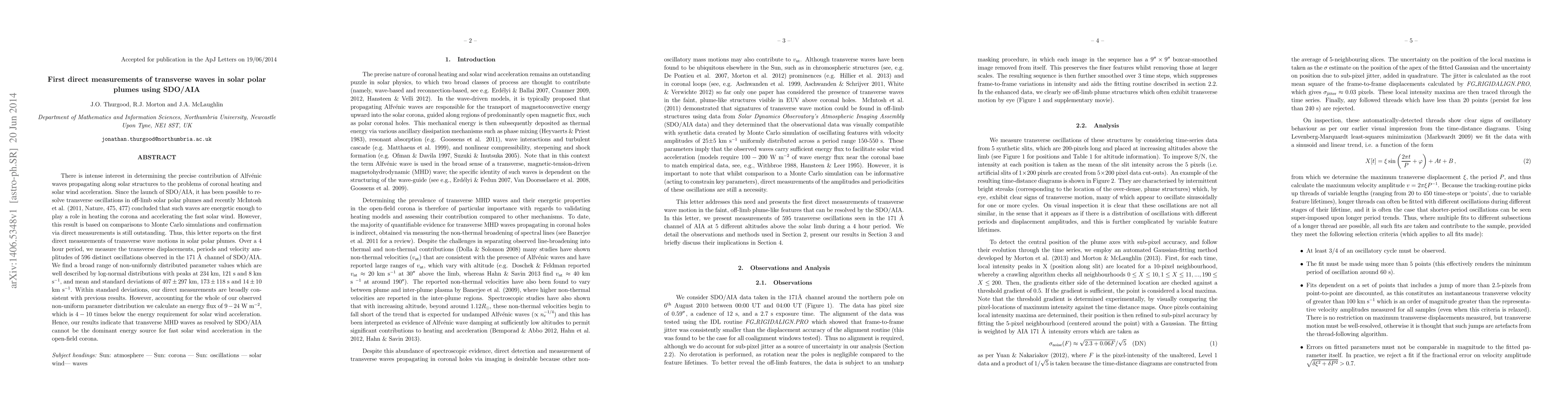 There is intense interest in determining the precise contribution of Alfv\'enic waves propagating along solar structures to the problems of coronal heating and solar wind acceleration. Since the launch of SDO/AIA, it has been possible to resolve transverse oscillations in off-limb solar polar plumes and recently McIntosh et al. (2011, Nature, 475, 477) concluded that such waves are energetic enough to play a role in heating the corona and accelerating the fast solar wind. However, this result is based on comparisons to Monte Carlo simulations and confirmation via direct measurements is still outstanding. Thus, this letter reports on the first direct measurements of transverse wave motions in solar polar plumes. Over a 4 hour period, we measure the transverse displacements, periods and velocity amplitudes of 596 distinct oscillations observed in the 171 \AA channel of SDO/AIA. We find a broad range of non-uniformly distributed parameter values which are well described by log-normal distributions with peaks at $234$ km, $121$ s and $8$ km s$^{-1}$, and mean and standard deviations of $407\pm297$ km, $173\pm118$ s and $14\pm10$ km s$^{-1}$. Within standard deviations, our direct measurements are broadly consistent with previous results. However, accounting for the whole of our observed non-uniform parameter distribution we calculate an energy flux of $9-24$ W m$^{-2}$, which is $4-10$ times below the energy requirement for solar wind acceleration. Hence, our results indicate that transverse MHD waves as resolved by SDO/AIA cannot be the dominant energy source for fast solar wind acceleration in the open-field corona.