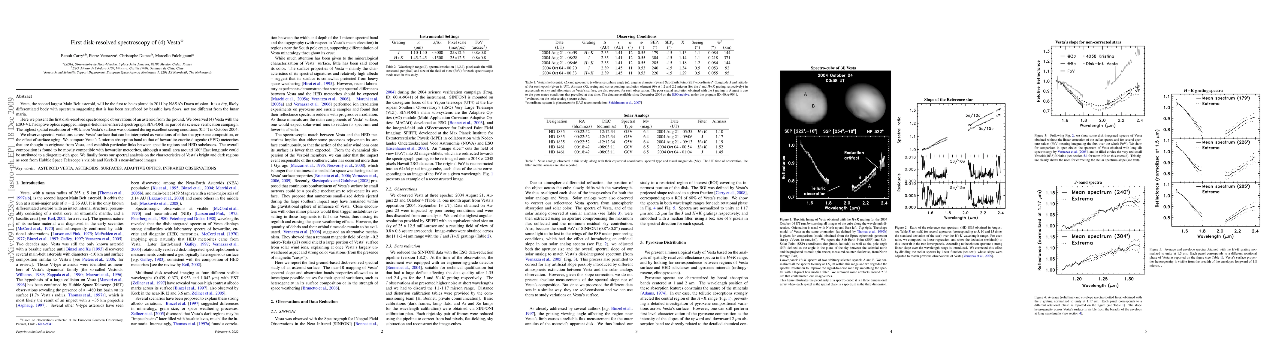 This paper presents the first ground-based disk-resolved spectroscopy of the asteroid (4) Vesta, revealing spectral variations across its surface that suggest variations in pyroxene composition or surface aging. The study links Vesta's spectral features to howardite-eucrite-diogenite meteorites, identifying a small diogenite-rich area and correlating bright and dark regions with Hubble and Keck observations.