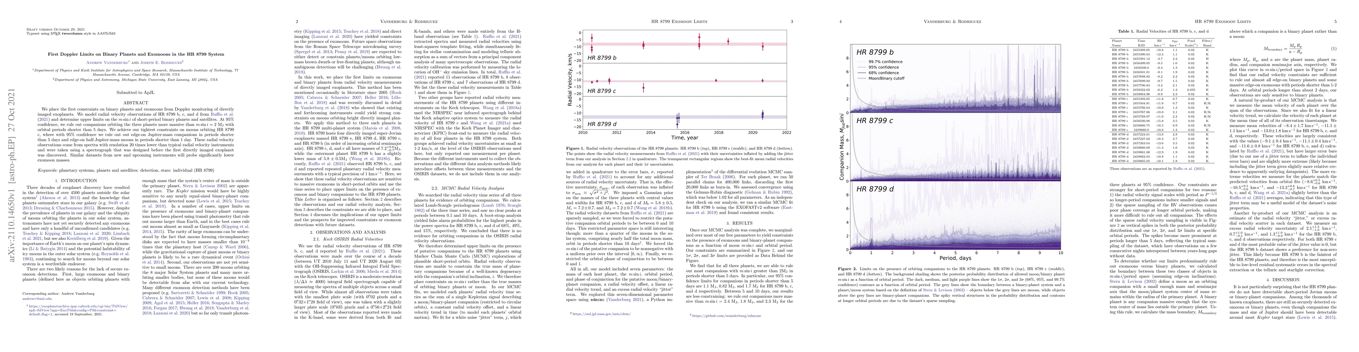 This study sets the first Doppler limits on binary planets and exomoons in the HR 8799 system, ruling out companions more massive than 2 Jupiter masses for short-period orbits around HR 8799 b, c, and d, and tighter constraints on moons orbiting HR 8799 c. These findings are based on radial velocity observations from spectrographs with lower resolution than typical instruments.
