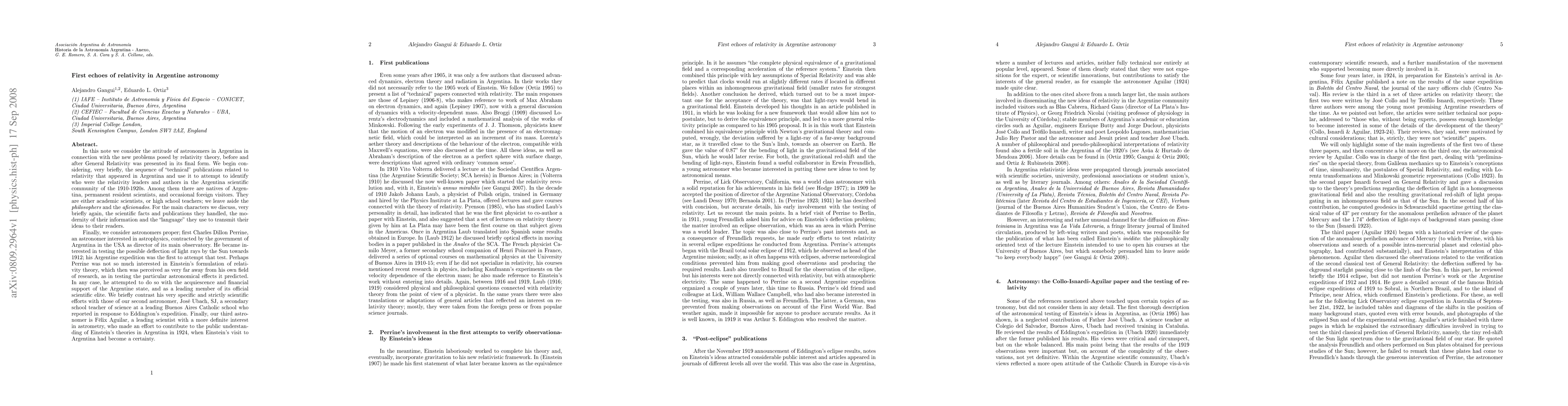 We consider the attitude of astronomers in Argentina in connection with the new problems posed by relativity theory, before and after GR was presented. We begin considering the sequence of "technical" publications that appeared and use it to attempt to identify who were the relativity leaders and authors in the Argentina scientific community of the 1910-1920s. Among them there are natives of Argentina, permanent resident scientists, and occasional foreign visitors. They are either academic scientists, or high school teachers; we leave aside the {\it philosophers} and the {\it aficionados}. We discuss the scientific facts and publications they handled, the modernity of their information and the "language" they use to transmit their ideas. Finally, we consider astronomers proper; first Charles Perrine, an astronomer interested in astrophysics, contracted by the government of Argentina in the USA as director of its main observatory. He became interested in testing the possible deflection of light rays by the Sun towards 1912; his Argentine expedition was the first to attempt that test. Perhaps Perrine was not so much interested in relativity as in testing the particular astronomical effects it predicted. In any case, he attempted the test with the acquiescence and financial support of the Argentine state, and as a leading member of its official scientific elite. We contrast his very specific and strictly scientific efforts with those of our second astronomer, Jos\'e Ubach, SJ, a secondary school teacher of science at a leading Buenos Aires Catholic school who reported in response to Eddington's expedition. Finally, our third astronomer is F\'elix Aguilar, who made an effort to contribute to the public understanding of Einstein's theories in 1924, when Einstein's visit to Argentina had become a certainty. [abridged]