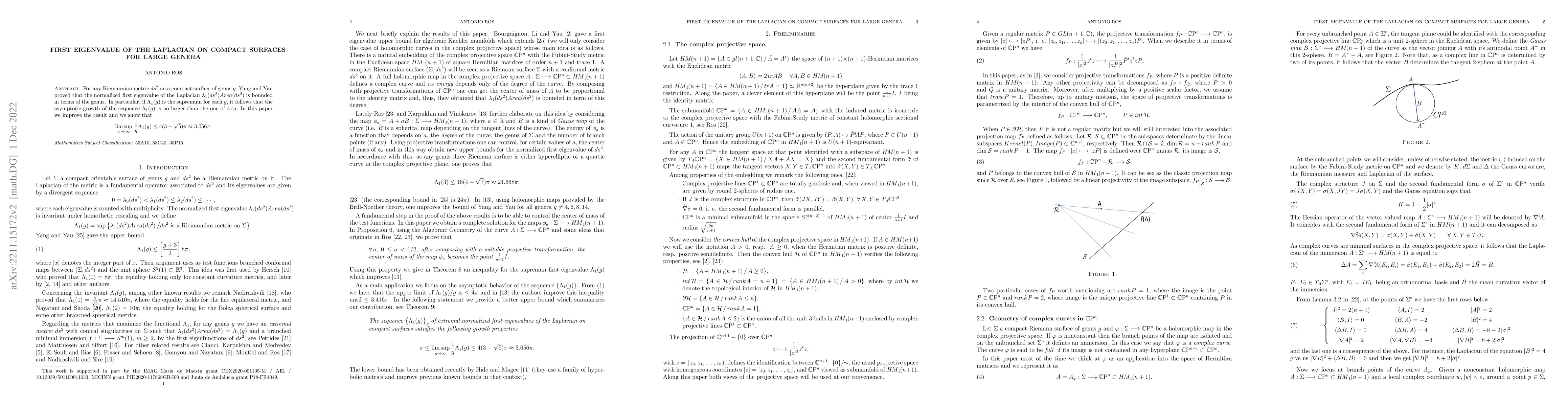 This paper improves upon the result by Yang and Yau regarding the upper bound of the first eigenvalue of the Laplacian on compact surfaces of genus $g$, showing that $\limsup_{g \rightarrow \infty} \frac{1}{g}\Lambda_1(g) \leq 4(3-\sqrt{5})\pi \approx 3.056\pi$ for large genera.