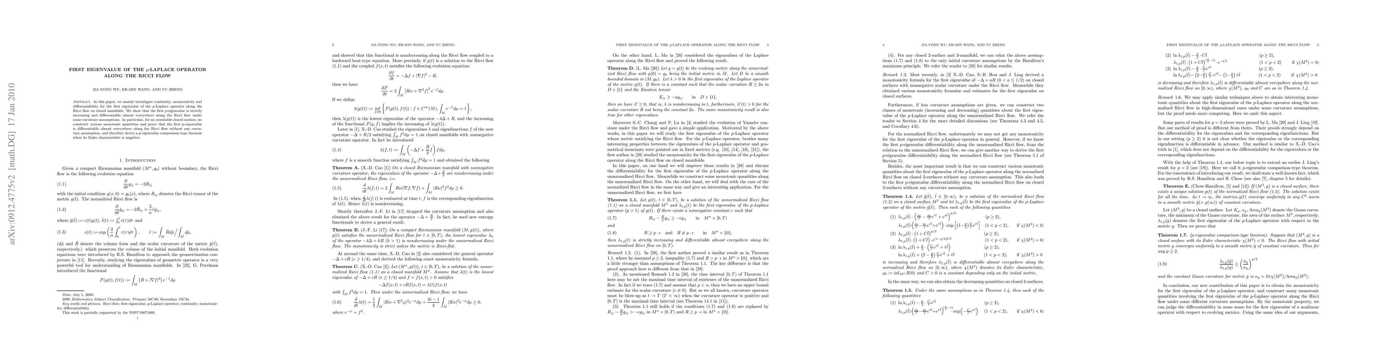 This paper investigates the first eigenvalue of the $p$-Laplace operator along the Ricci flow, proving its strict increase and differentiability almost everywhere under curvature conditions. For orientable closed surfaces, it demonstrates differentiability without curvature assumptions and establishes a comparison theorem for negative Euler characteristic.