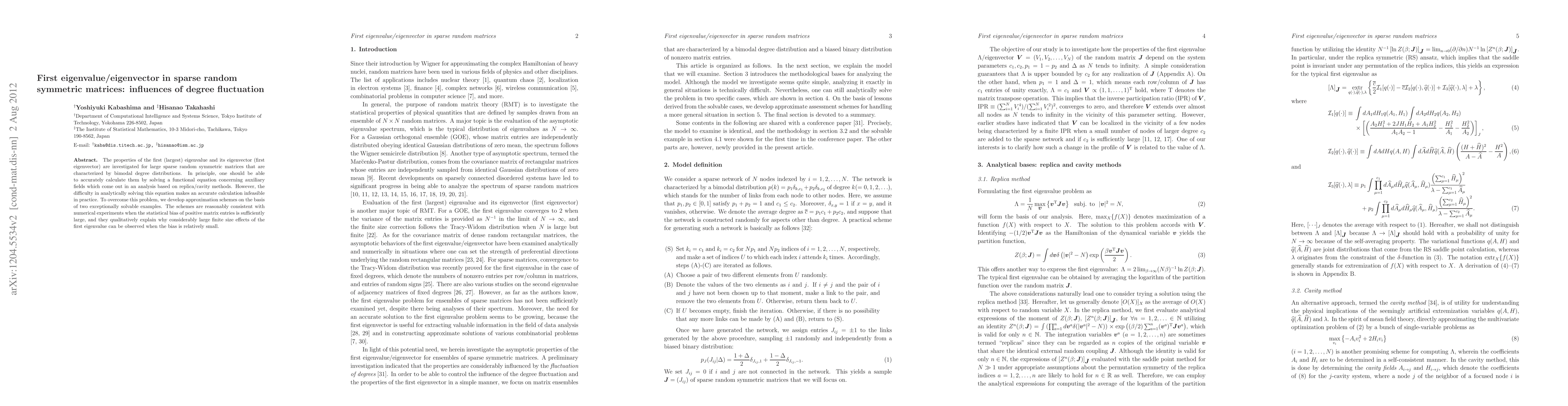 This paper investigates the first eigenvalue and its eigenvector in large sparse random symmetric matrices with bimodal degree distributions, developing approximation schemes to overcome analytical difficulties. The schemes align well with numerical experiments when the matrix entries' statistical bias is high, explaining significant finite size effects when the bias is low.