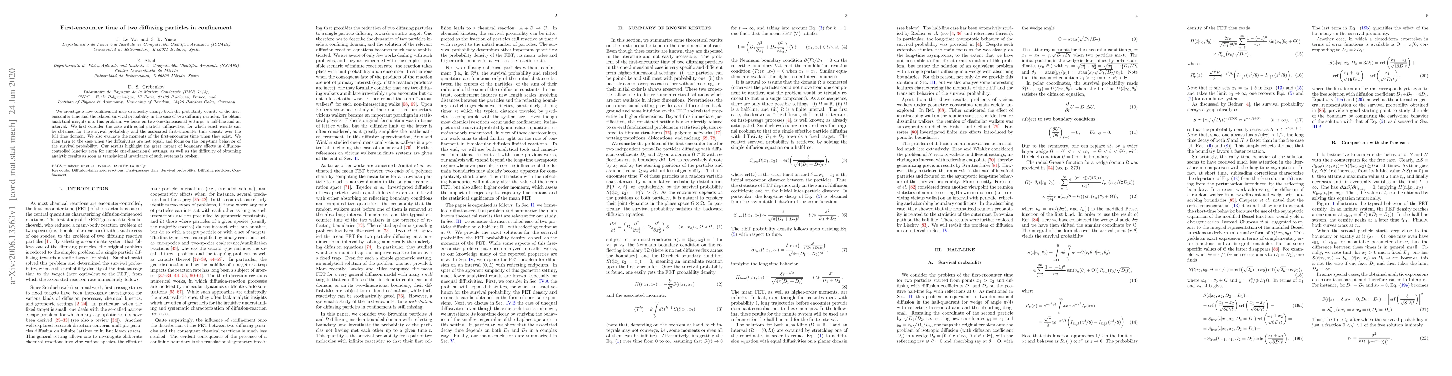 This research explores how confinement impacts the first-encounter time of two diffusing particles in one-dimensional settings like half-lines and intervals. It derives exact results for equal diffusivities, analyzing survival probability and first-encounter time density. For unequal diffusivities, it examines long-time survival probability behavior, revealing significant boundary effects and analytic challenges due to broken translational invariance.