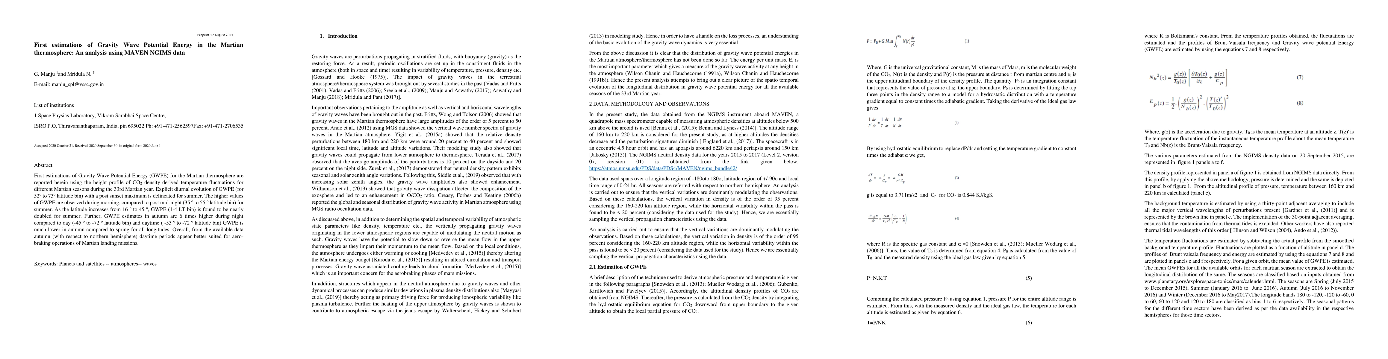 This study reports initial estimates of Gravity Wave Potential Energy (GWPE) in the Martian thermosphere using MAVEN NGIMS data, revealing significant seasonal and latitudinal variations. Higher GWPE values are observed during the Martian summer mornings and autumn nights, suggesting autumn daytime as optimal for aero-braking missions.