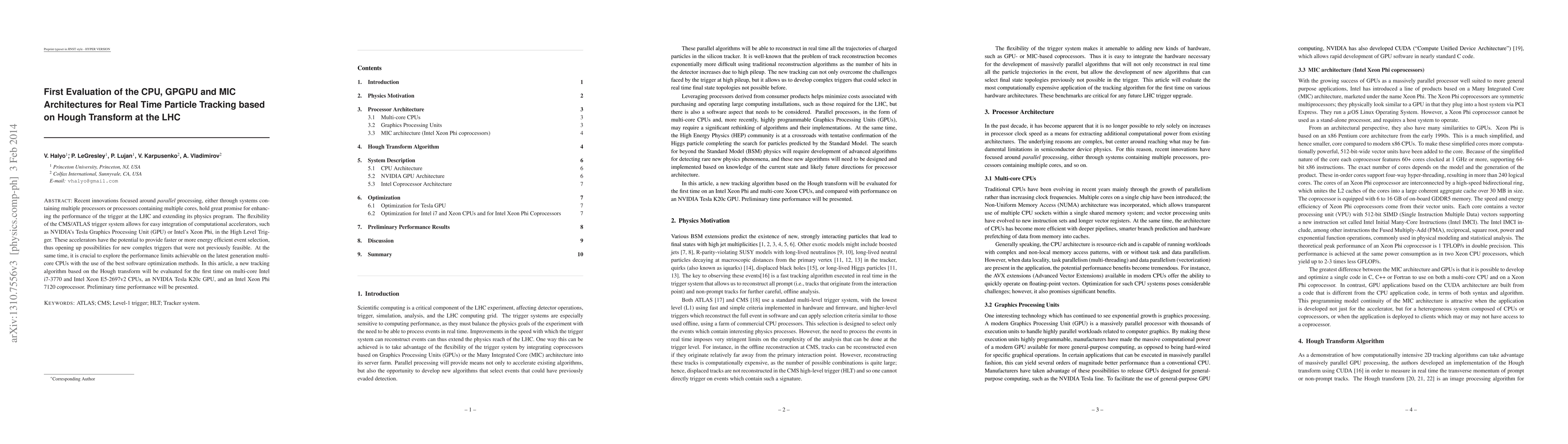 Recent innovations focused around {\em parallel} processing, either through systems containing multiple processors or processors containing multiple cores, hold great promise for enhancing the performance of the trigger at the LHC and extending its physics program. The flexibility of the CMS/ATLAS trigger system allows for easy integration of computational accelerators, such as NVIDIA's Tesla Graphics Processing Unit (GPU) or Intel's \xphi, in the High Level Trigger. These accelerators have the potential to provide faster or more energy efficient event selection, thus opening up possibilities for new complex triggers that were not previously feasible. At the same time, it is crucial to explore the performance limits achievable on the latest generation multicore CPUs with the use of the best software optimization methods. In this article, a new tracking algorithm based on the Hough transform will be evaluated for the first time on a multi-core Intel Xeon E5-2697v2 CPU, an NVIDIA Tesla K20c GPU, and an Intel \xphi\ 7120 coprocessor. Preliminary time performance will be presented.