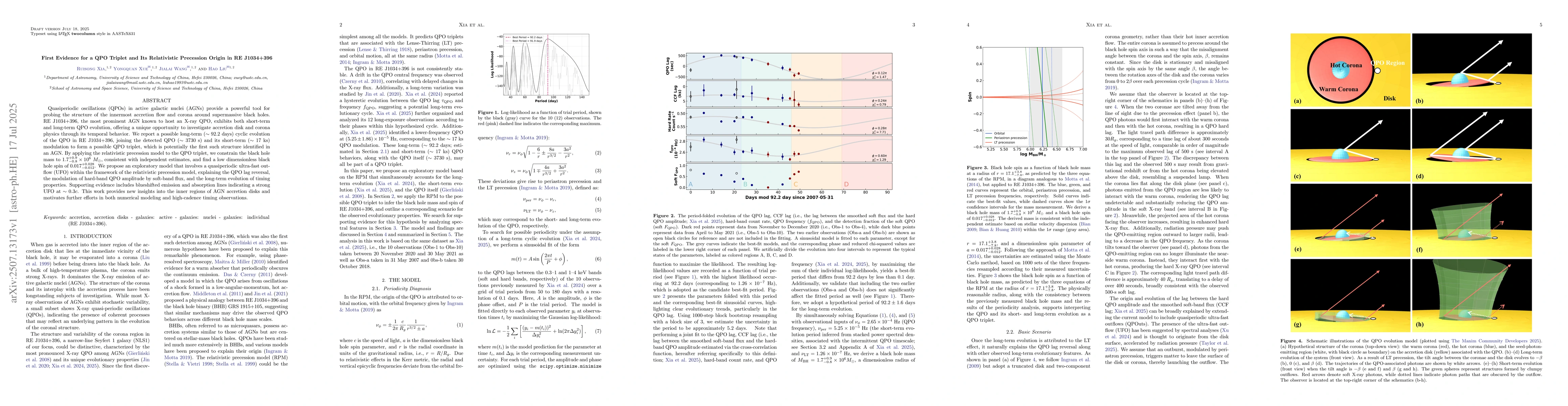 Quasiperiodic oscillations (QPOs) in active galactic nuclei (AGNs) provide a powerful tool for probing the structure of the innermost accretion flow and corona around supermassive black holes. RE~J1034+396, the most prominent AGN known to host an X-ray QPO, exhibits both short-term and long-term QPO evolution, offering a unique opportunity to investigate accretion disk and corona physics through its temporal behavior. We report a possible long-term ($\sim 92.2$ days) cyclic evolution of the QPO in RE~J1034+396, joining the detected QPO ($\sim 3730$ s) and its short-term ($\sim 17$ ks) modulation to form a possible QPO triplet, which is potentially the first such structure identified in an AGN. By applying the relativistic precession model to the QPO triplet, we constrain the black hole mass to $1.7^{+0.9}_{-0.8} \times 10^{6}\ M_\odot$, consistent with independent estimates, and find a low dimensionless black hole spin of $0.017^{+0.028}_{-0.012}$. We propose an exploratory model that involves a quasiperiodic ultra-fast outflow (UFO) within the framework of the relativistic precession model, explaining the QPO lag reversal, the modulation of hard-band QPO amplitude by soft-band flux, and the long-term evolution of timing properties. Supporting evidence includes blueshifted emission and absorption lines indicating a strong UFO at $\sim 0.3c$. This work provides new insights into the inner regions of AGN accretion disks and motivates further efforts in both numerical modeling and high-cadence timing observations.