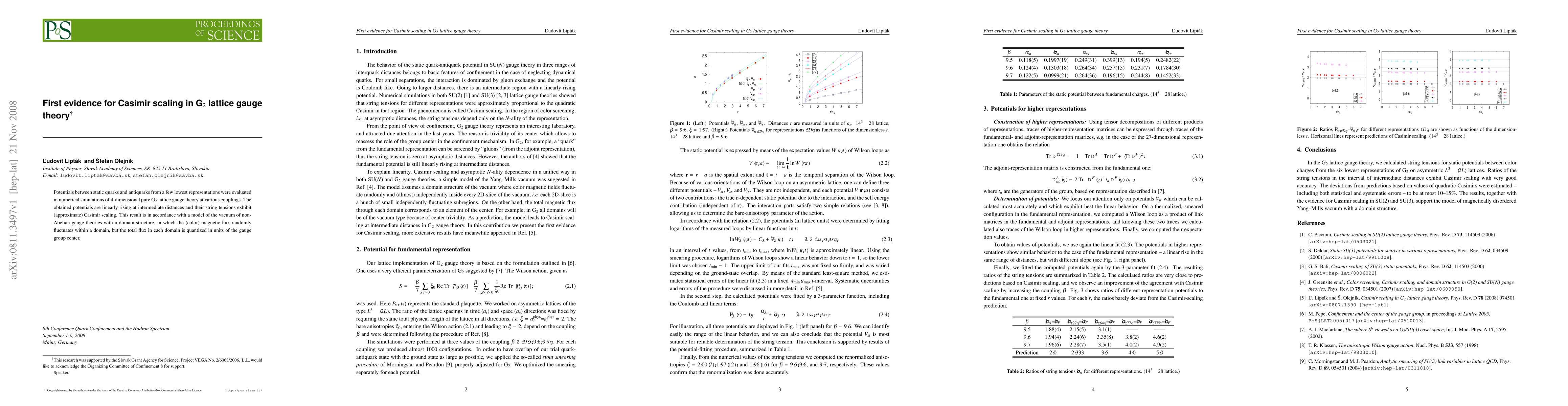 This study provides the first evidence for Casimir scaling in 4-dimensional G$_2$ lattice gauge theory, demonstrating linearly rising potentials between static quarks at intermediate distances and confirming the model's prediction of quantized magnetic flux within domains.