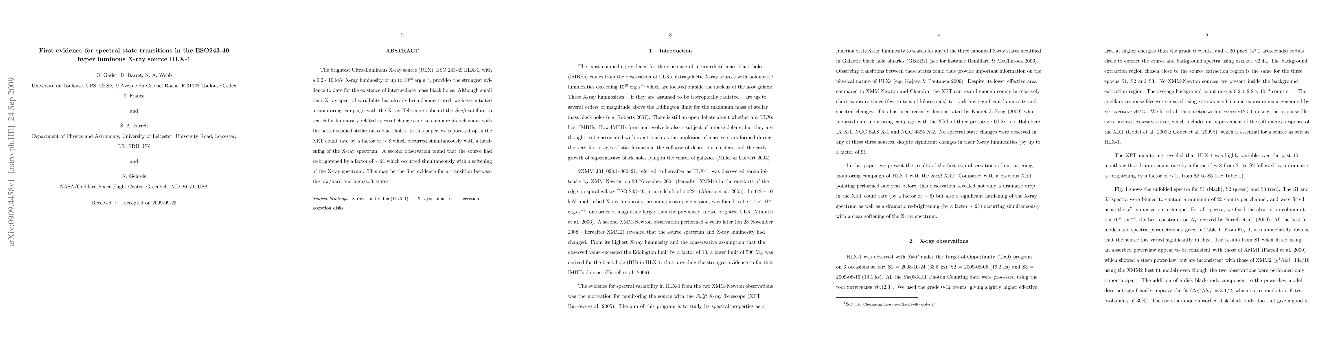 The brightest Ultra-Luminous X-ray source (ULX), ESO 243-49 HLX-1, with a 0.2 - 10 keV X-ray luminosity of up to 10^42 erg s^-1, provides the strongest evidence to date for the existence of intermediate mass black holes. Although small scale X-ray spectral variability has already been demonstrated, we have initiated a monitoring campaign with the X-ray Telescope onboard the Swift satellite to search for luminosity-related spectral changes and to compare its behavior with the better studied stellar mass black holes. In this paper, we report a drop in the XRT count rate by a factor of ~8 which occurred simultaneously with a hardening of the X-ray spectrum. A second observation found that the source had re-brightened by a factor of ~21 which occurred simultaneously with a softening of the X-ray spectrum. This may be the first evidence for a transition between the low/hard and high/soft states.