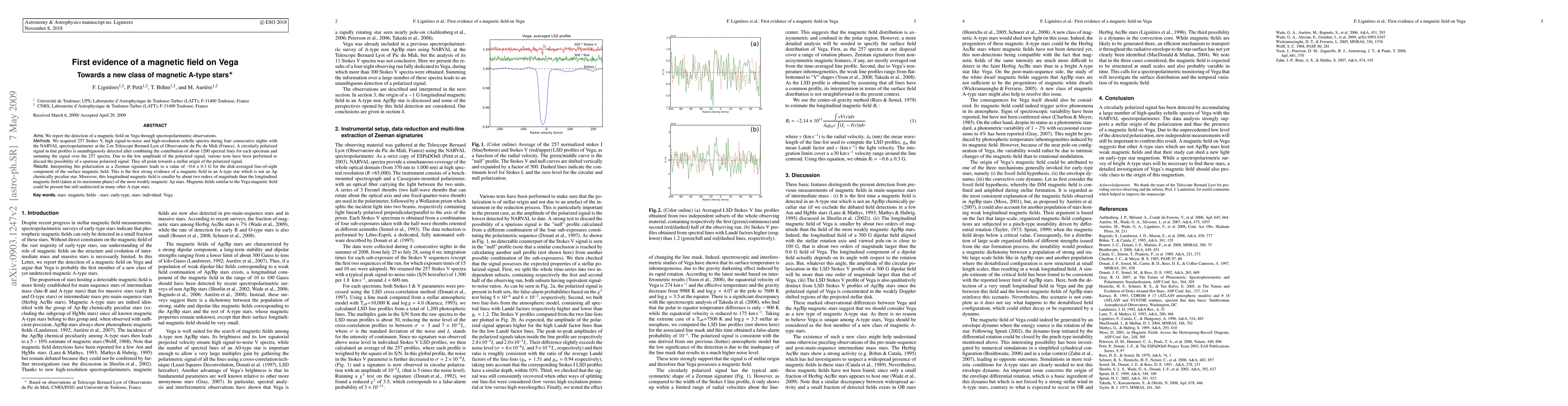 We report the detection of a magnetic field on Vega through spectropolarimetric observations. We acquired 257 Stokes V, high signal-to-noise and high-resolution echelle spectra during four consecutive nights with the NARVAL spectropolarimeter at the 2-m Telescope Bernard Lyot of Observatoire du Pic du Midi (France). A circularly polarized signal in line profiles is unambiguously detected after combining the contribution of about 1200 spectral lines for each spectrum and summing the signal over the 257 spectra. Due to the low amplitude of the polarized signal, various tests have been performed to discard the possibility of a spurious polarized signal. They all point towards a stellar origin of the polarized signal. Interpreting this polarization as a Zeeman signature leads to a value of $-0.6 \pm 0.3$ G for the disk-averaged line-of-sight component of the surface magnetic field. This is the first strong evidence of a magnetic field in an A-type star which is not an Ap chemically peculiar star. Moreover, this longitudinal magnetic field is smaller by about two orders of magnitude than the longitudinal magnetic field (taken at its maximum phase) of the most weakly magnetic Ap stars. Magnetic fields similar to the Vega magnetic field could be present but still undetected in many other A-type stars.