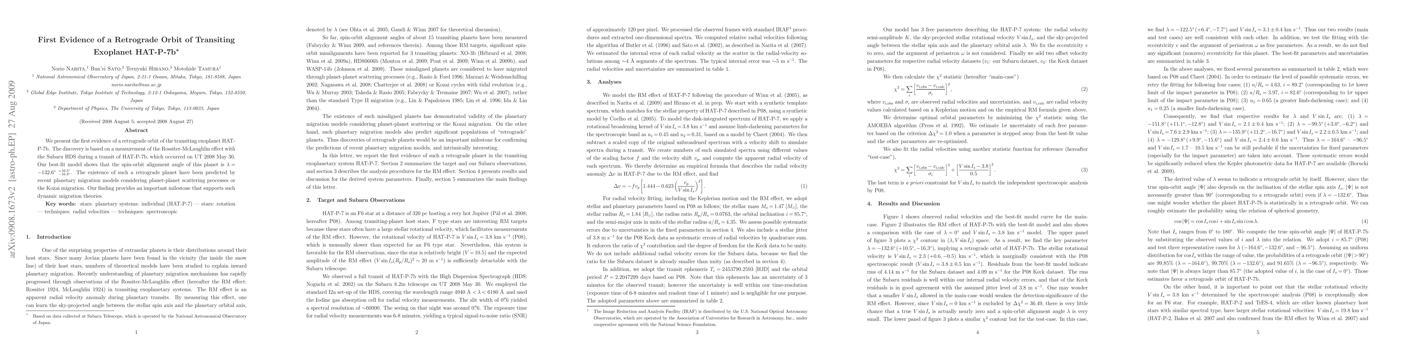 This paper presents the first evidence of the retrograde orbit of the transiting exoplanet HAT-P-7b, discovered through the Rossiter-McLaughlin effect measurement. The findings support recent planetary migration theories involving planet-planet scattering or Kozai migration.