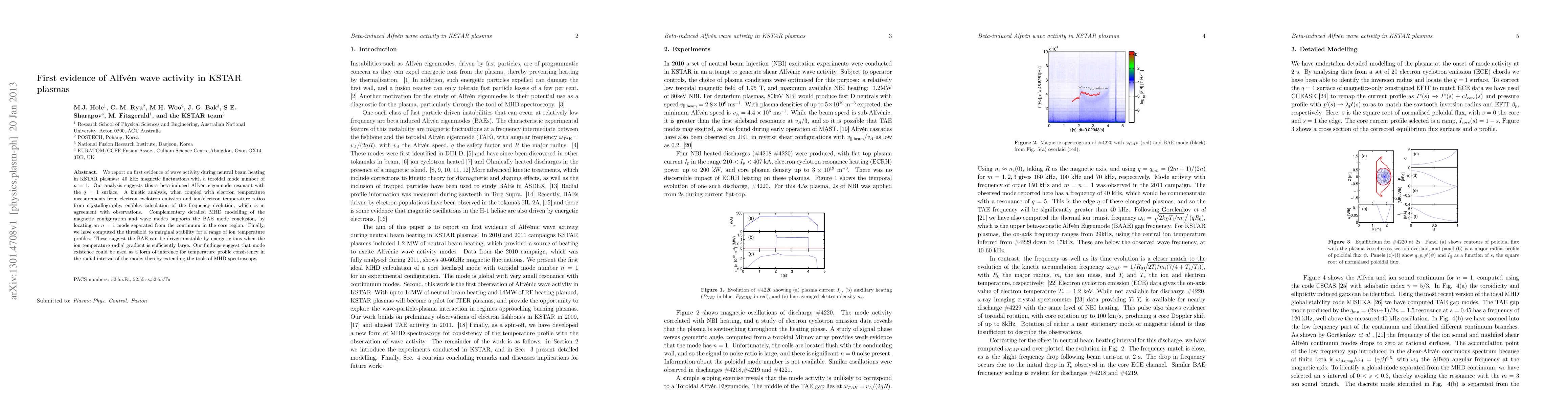 This paper presents the first evidence of Alfven wave activity in KSTAR plasmas during neutral beam heating, identifying a beta-induced Alfven eigenmode (BAE) resonant with the q=1 surface. The study combines kinetic analysis and MHD modelling to support the BAE mode, suggesting it can be driven unstable by energetic ions under specific temperature gradients.