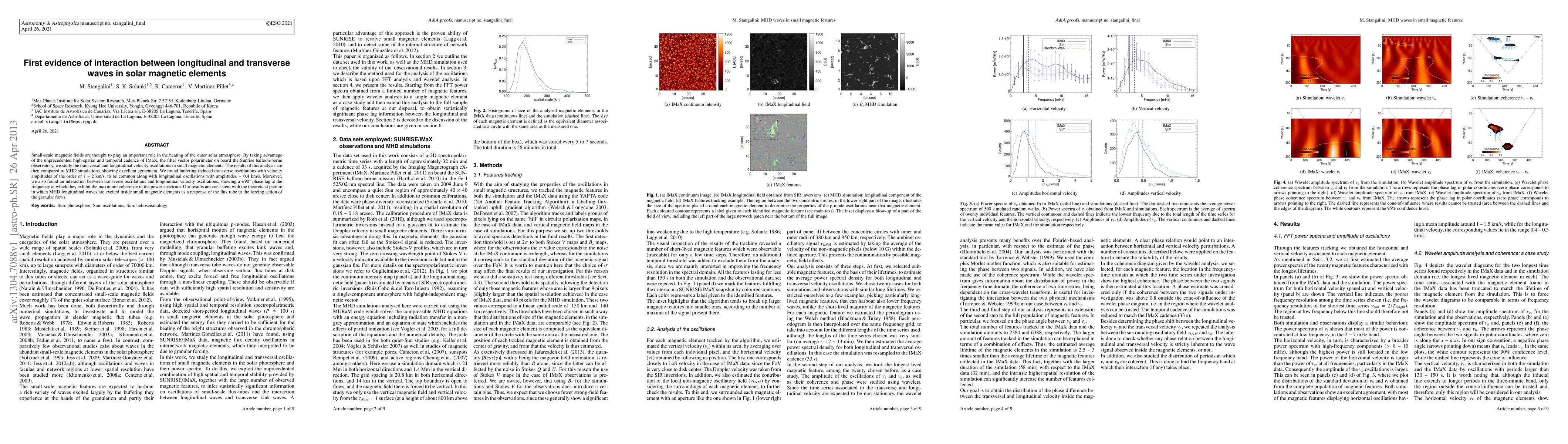 Using Sunrise observatory's IMaX instrument, researchers discovered evidence of interaction between longitudinal and transverse waves in solar magnetic elements. These waves, with amplitudes of 1-2 km/s for transverse and 0.4 km/s for longitudinal, showed a phase lag of +-90 degrees. This supports the theory that granular flows force magnetic flux tubes to generate MHD longitudinal waves.