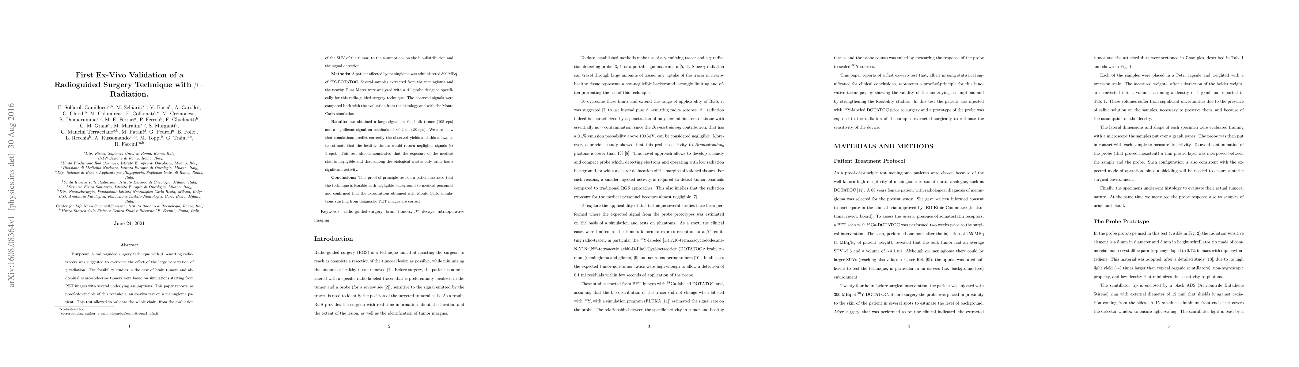 Purpose: A radio-guided surgery technique with beta- -emitting radio-tracers was suggested to overcome the effect of the large penetration of gamma radiation. The feasibility studies in the case of brain tumors and abdominal neuro-endocrine tumors were based on simulations starting from PET images with several underlying assumptions. This paper reports, as proof-of-principle of this technique, an ex-vivo test on a meningioma patient. This test allowed to validate the whole chain, from the evaluation of the SUV of the tumor, to the assumptions on the bio-distribution and the signal detection. Methods: A patient affected by meningioma was administered 300 MBq of 90Y-DOTATOC. Several samples extracted from the meningioma and the nearby Dura Mater were analyzed with a beta- probe designed specifically for this radio-guided surgery technique. The observed signals were compared both with the evaluation from the histology and with the Monte Carlo simulation. Results: we obtained a large signal on the bulk tumor (105 cps) and a significant signal on residuals of $\sim$0.2 ml (28 cps). We also show that simulations predict correctly the observed yields and this allows us to estimate that the healthy tissues would return negligible signals (~1 cps). This test also demonstrated that the exposure of the medical staff is negligible and that among the biological wastes only urine has a significant activity. Conclusions: This proof-of-principle test on a patient assessed that the technique is feasible with negligible background to medical personnel and confirmed that the expectations obtained with Monte Carlo simulations starting from diagnostic PET images are correct.