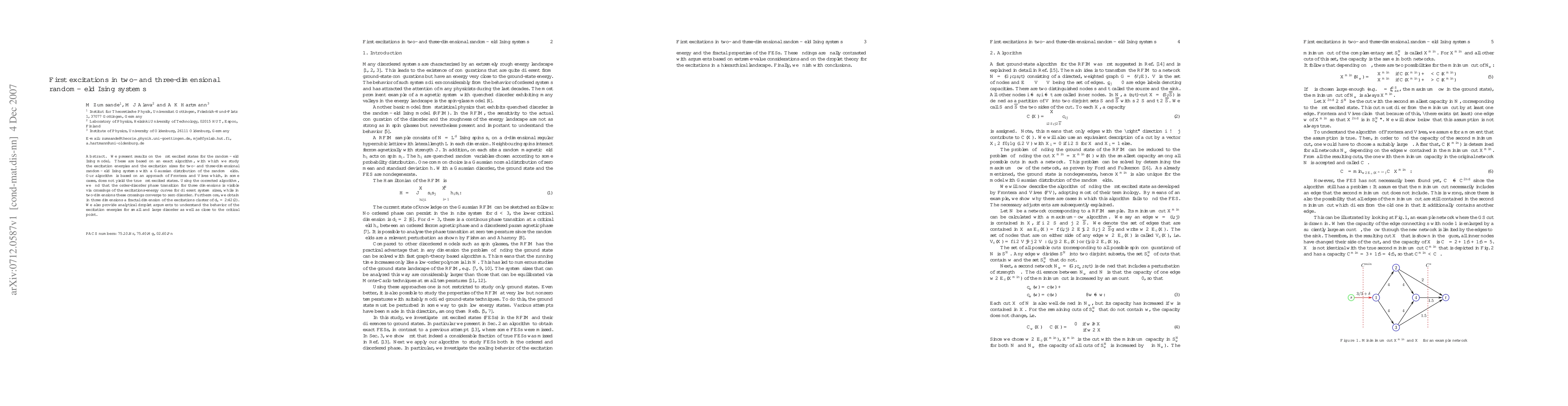 This paper presents an exact algorithm for studying first excitations in two- and three-dimensional random-field Ising systems, revealing phase transitions via excitation energy crossings and determining a fractal dimension for excitation clusters in three dimensions. The findings include a fractal dimension of d_s=2.42(2) and analytical droplet arguments for excitation energy behavior.