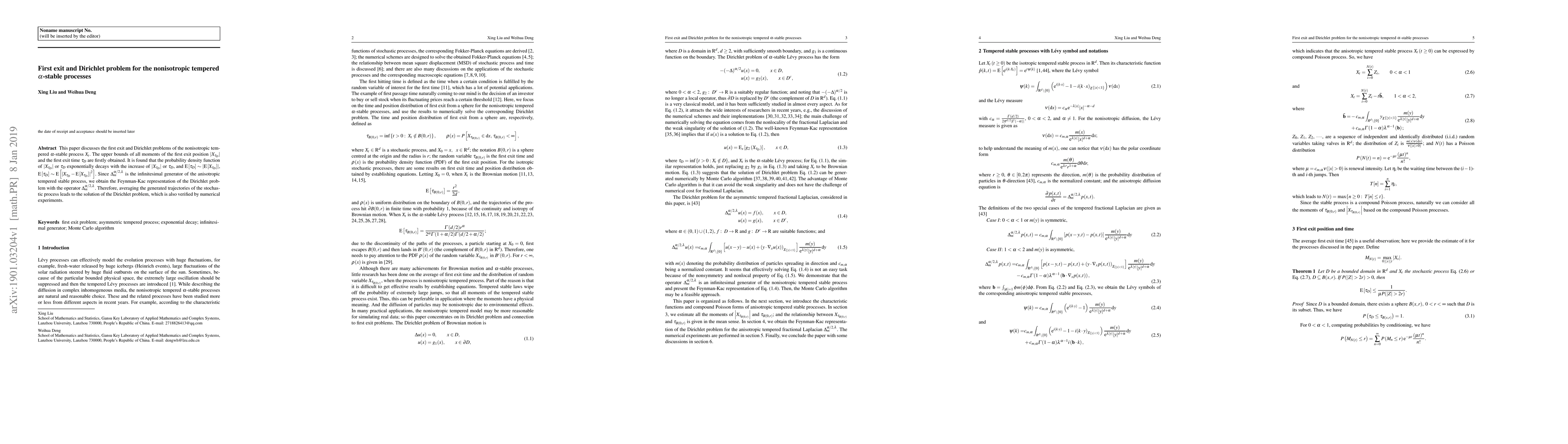 This paper discusses the first exit and Dirichlet problems of the nonisotropic tempered $\alpha$-stable process $X_t$. The upper bounds of all moments of the first exit position $\left|X_{\tau_D}\right|$ and the first exit time $\tau_D$ are firstly obtained. It is found that the probability density function of $\left|X_{\tau_D}\right|$ or $\tau_D$ exponentially decays with the increase of $\left|X_{\tau_D}\right|$ or $\tau_D$, and $\mathrm{E}\left[\tau_D\right]\sim \left|\mathrm{E}\left[X_{\tau_D}\right]\right|$,\ $\mathrm{E}\left[\tau_D\right]\sim\mathrm{E}\left[\left|X_{\tau_D}-\mathrm{E}\left[X_{\tau_D}\right]\right|^2\right] $. Since $\mathrm{\Delta}^{\alpha/2,\lambda}_m$ is the infinitesimal generator of the anisotropic tempered stable process, we obtain the Feynman-Kac representation of the Dirichlet problem with the operator $\mathrm{\Delta}^{\alpha/2,\lambda}_m$. Therefore, averaging the generated trajectories of the stochastic process leads to the solution of the Dirichlet problem, which is also verified by numerical experiments.