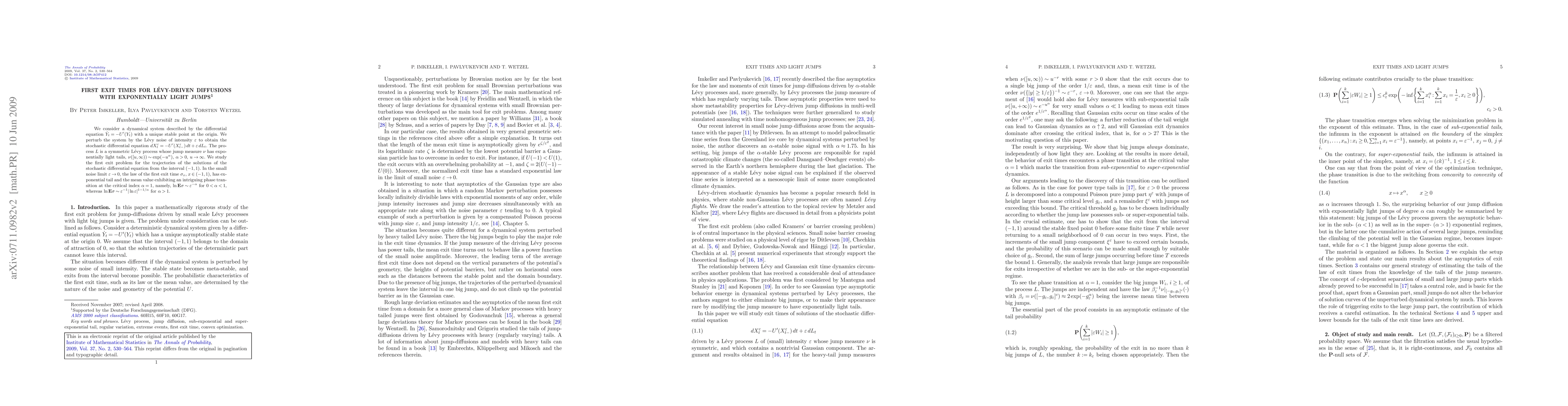 We consider a dynamical system described by the differential equation $\dot{Y}_t=-U'(Y_t)$ with a unique stable point at the origin. We perturb the system by the L\'evy noise of intensity $\varepsilon$ to obtain the stochastic differential equation $dX^{\varepsilon}_t=-U'(X^{\varepsilon}_{t-}) dt+\varepsilon dL_t.$ The process $L$ is a symmetric L\'evy process whose jump measure $\nu$ has exponentially light tails, $\nu([u,\infty))\sim\exp(-u^{\alpha})$, $\alpha>0$, $u\to \infty$. We study the first exit problem for the trajectories of the solutions of the stochastic differential equation from the interval $(-1,1)$. In the small noise limit $\varepsilon\to0$, the law of the first exit time $\sigma_x$, $x\in(-1,1)$, has exponential tail and the mean value exhibiting an intriguing phase transition at the critical index $\alpha=1$, namely, $\ln\mathbf{E}\sigma\sim\varepsilon^{-\alpha}$ for $0<\alpha<1$, whereas $\ln\mathbf{E}\sigma\sim\varepsilon^{- 1}|\ln\varepsilon|^{1-{1}/{\alpha}}$ for $\alpha>1$.