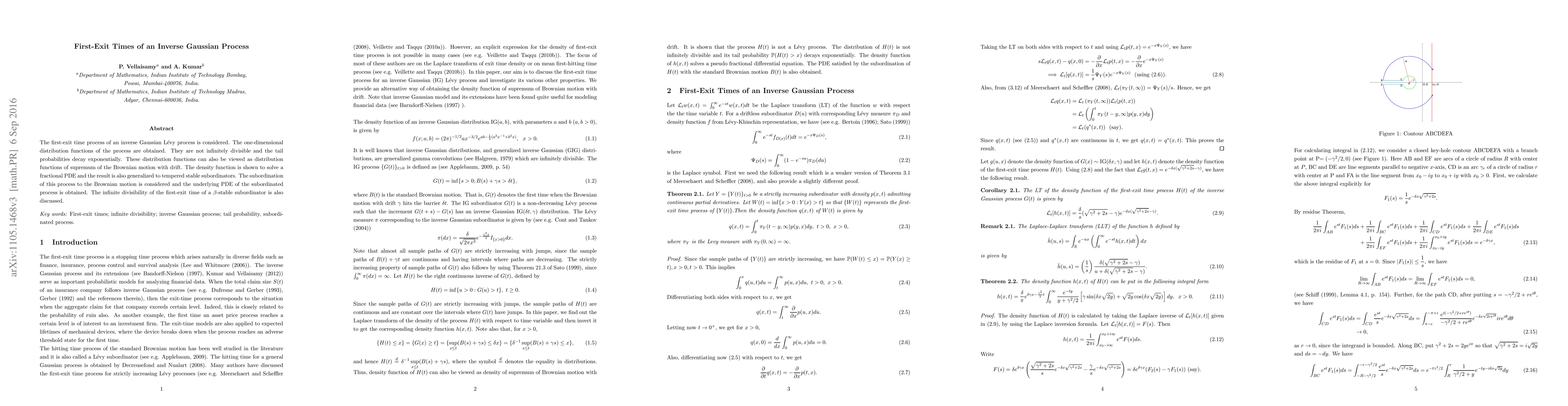 This paper investigates the first-exit time process of an inverse Gaussian Lévy process, finding its distribution functions and showing they solve a fractional PDE, with implications for tempered stable subordinators and infinite divisibility.