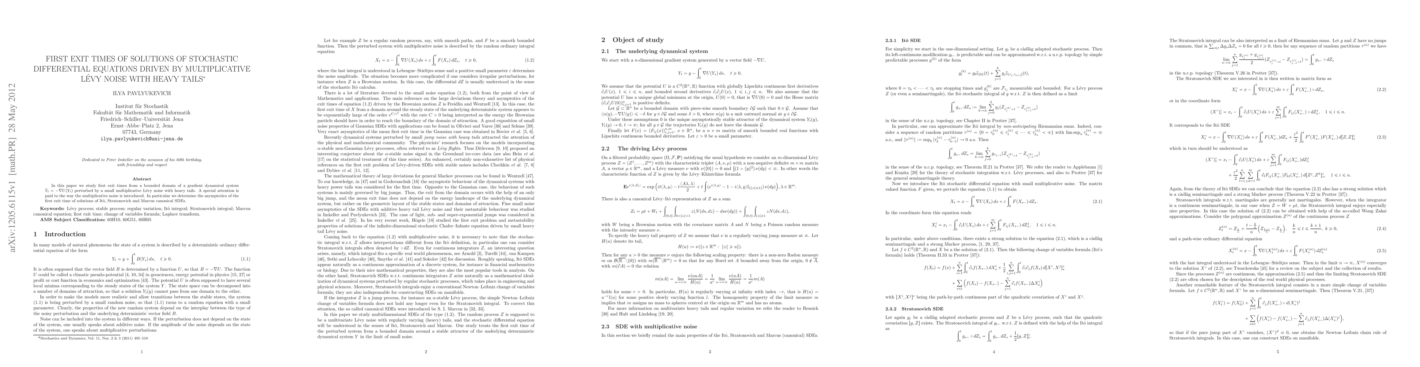 This paper investigates first exit times for solutions of stochastic differential equations driven by multiplicative Lévy noise with heavy tails, focusing on gradient dynamical systems perturbed by such noise. It determines the asymptotic behavior of first exit times for Itô, Stratonovich, and Marcus interpretations of these stochastic differential equations.