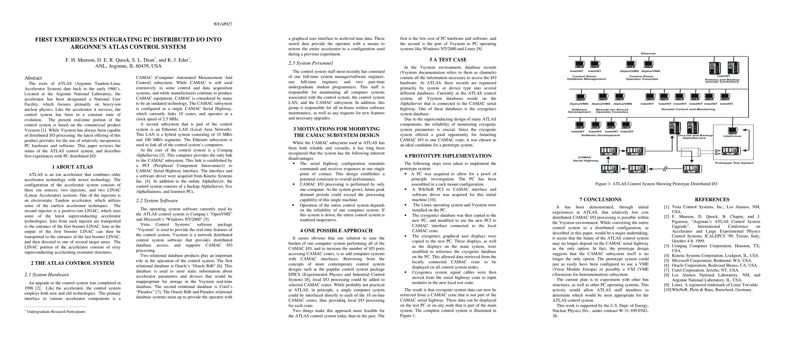 First Experiences Integrating PC Distributed I/O Into Argonne's ATLAS Control System The roots of ATLAS (Argonne Tandem-Linac Accelerator System) date back to the early 1960s. Located at the Argonne National Laboratory, the accelerator has been designated a National User Facility, which focuses primarily on heavy-ion nuclear physics. Like the accelerator it services, the control system has been in a constant state of evolution. The present real-time portion of the control system is based on the commercial product Vsystem [1]. While Vsystem has always been capable of distributed I/O processing, the latest offering of this product provides for the use of relatively inexpensive PC hardware and software. This paper reviews the status of the ATLAS control system, and describes first experiences with PC distributed I/O.