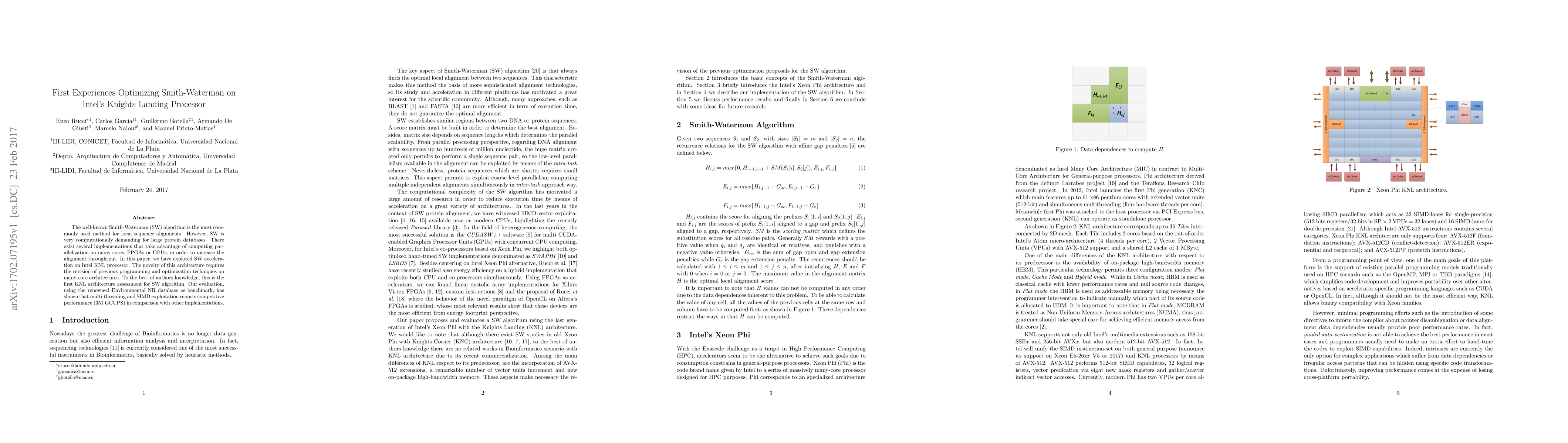 This paper investigates optimizing the Smith-Waterman algorithm for local sequence alignment on Intel's Knights Landing processor, demonstrating competitive performance (351 GCUPS) through multi-threading and SIMD exploitation, marking the first assessment of the KNL architecture for this algorithm.