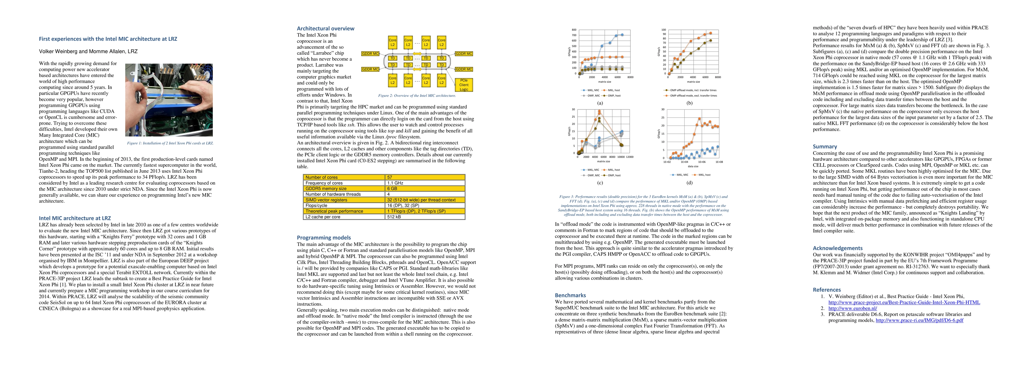 This paper shares initial experiences from LRZ in programming the Intel MIC architecture, which allows for easier parallel programming using OpenMP and MPI instead of CUDA or OpenCL. LRZ has been evaluating Intel's Xeon Phi coprocessors since 2010 and now shares insights following their release.
