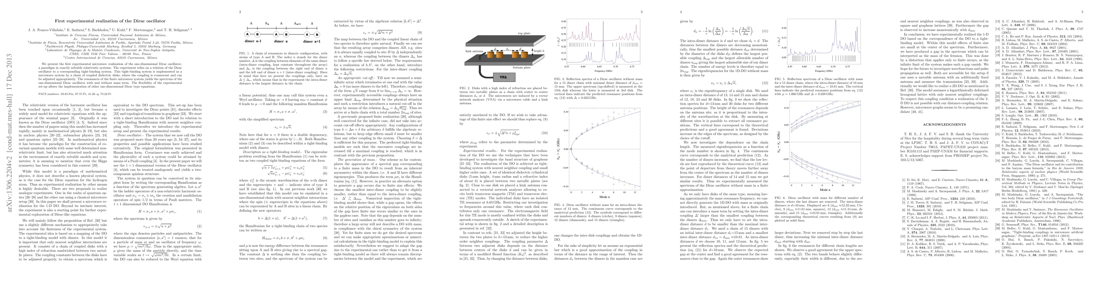 This paper reports the first experimental microwave realization of the Dirac oscillator, demonstrating its spectrum through a chain of coupled dielectric disks. The setup allows for the study of the Dirac oscillator's resonances and potential for implementing other Dirac-type equations.