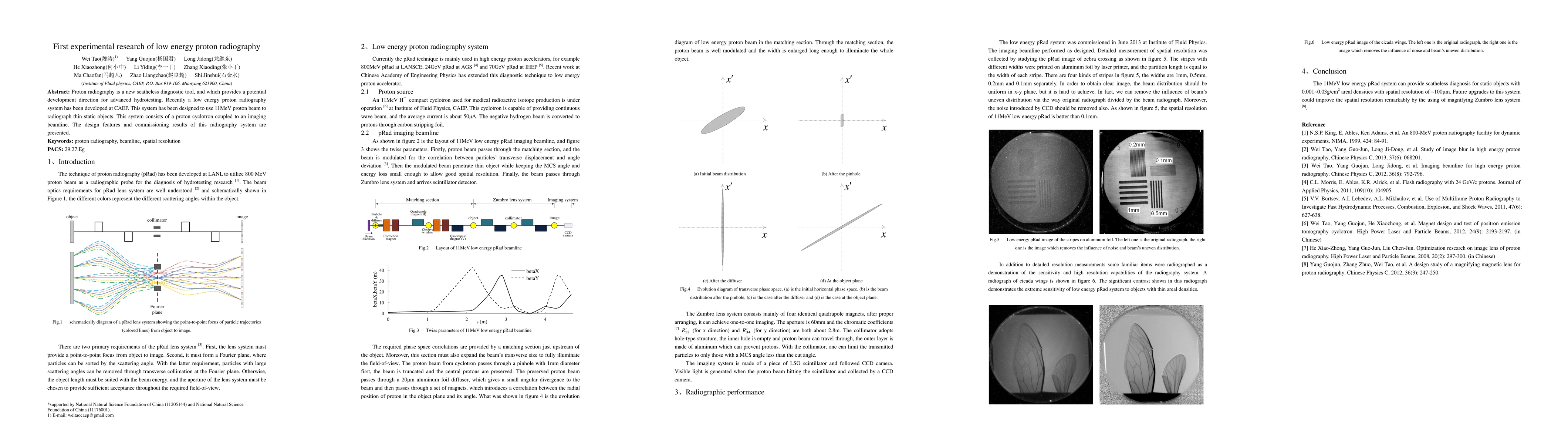 This paper presents the first experimental setup for low energy proton radiography using an 11MeV proton beam, developed at CAEP, featuring a proton cyclotron and imaging beamline, and reports on the system's design and initial commissioning results.